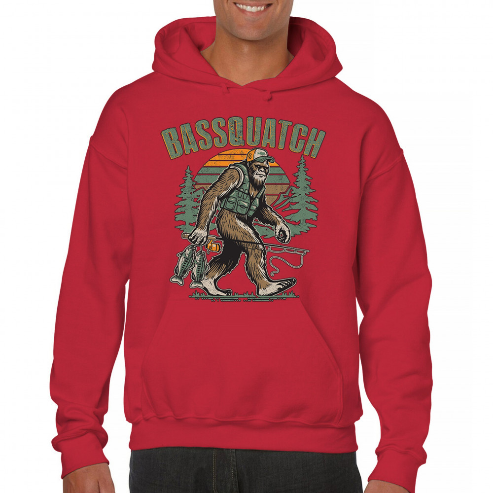 Funny Bassquatch design blends Bigfoot, fishing humor, and retro forest style. Great for anglers, cryptid lovers, and outdoorsy pun fans.