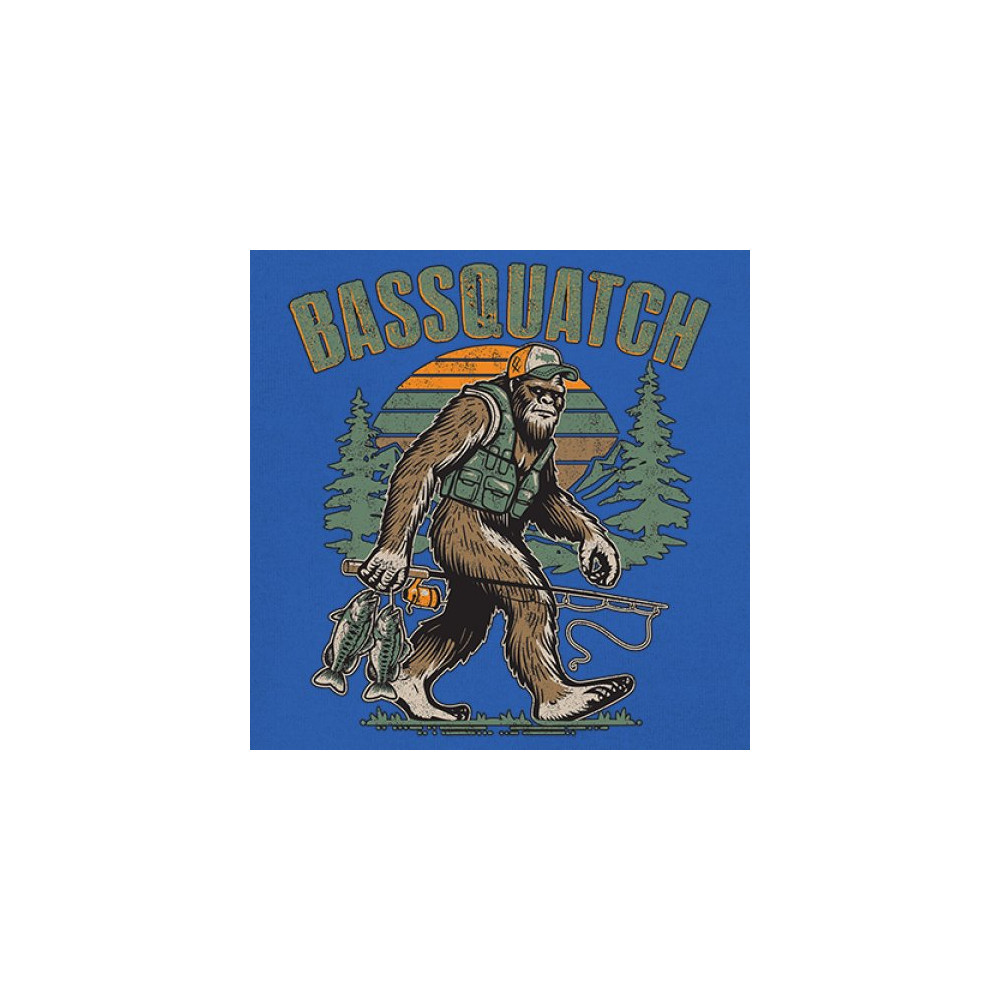 Funny Bassquatch design blends Bigfoot, fishing humor, and retro forest style. Great for anglers, cryptid lovers, and outdoorsy pun fans.