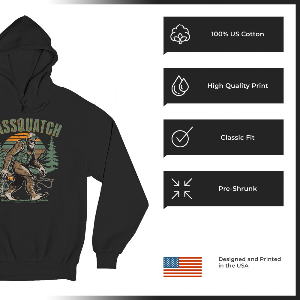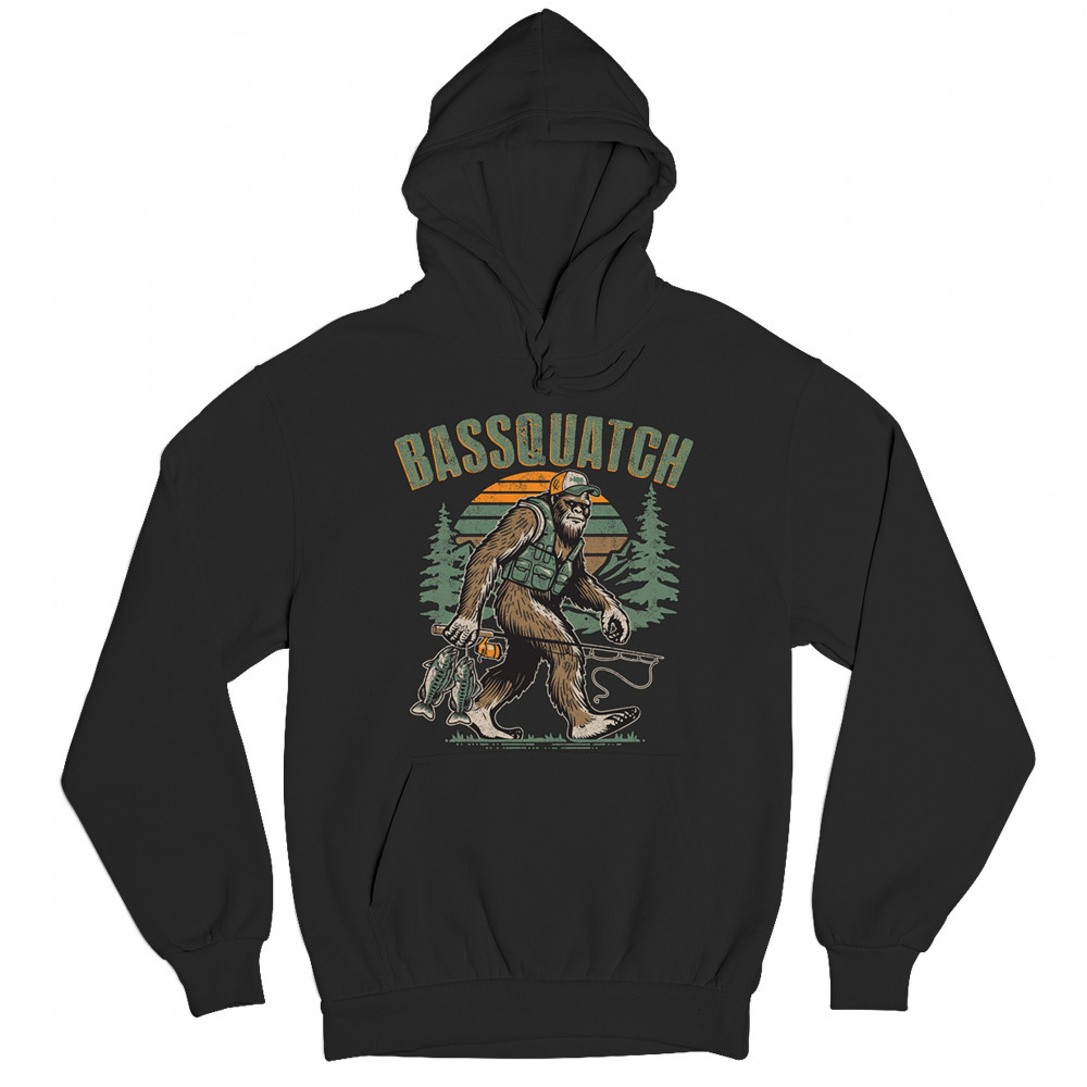 Funny Bassquatch design blends Bigfoot, fishing humor, and retro forest style. Great for anglers, cryptid lovers, and outdoorsy pun fans.
