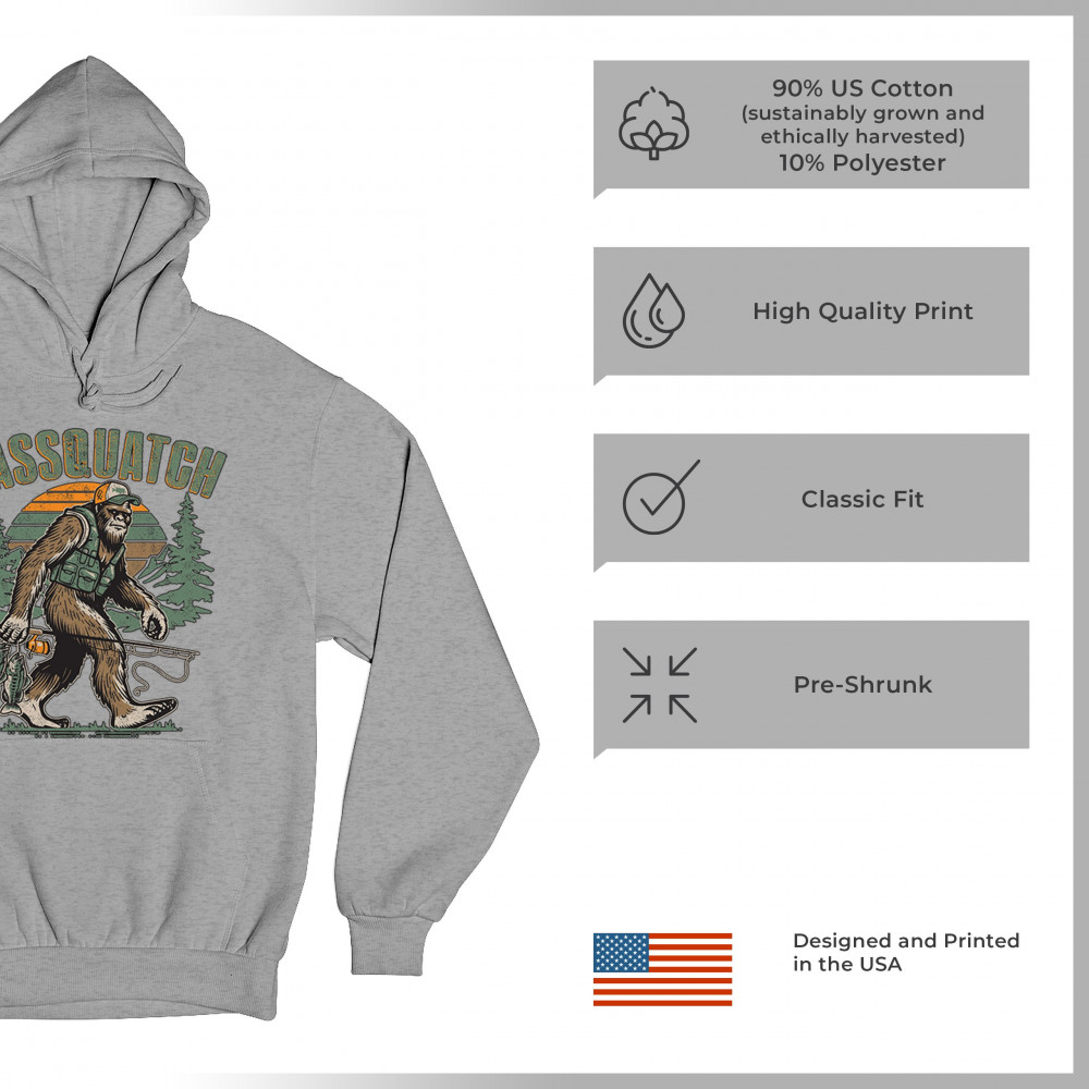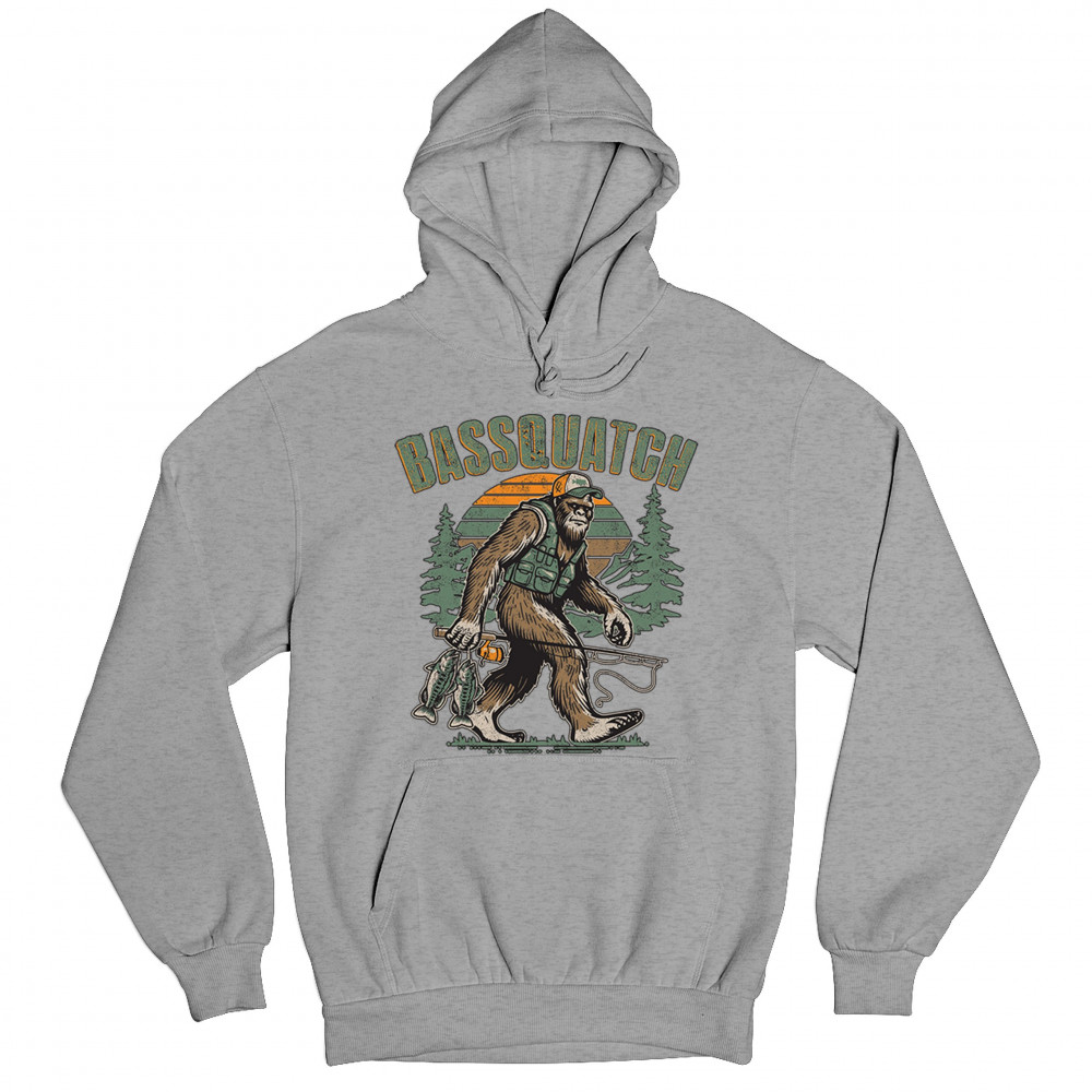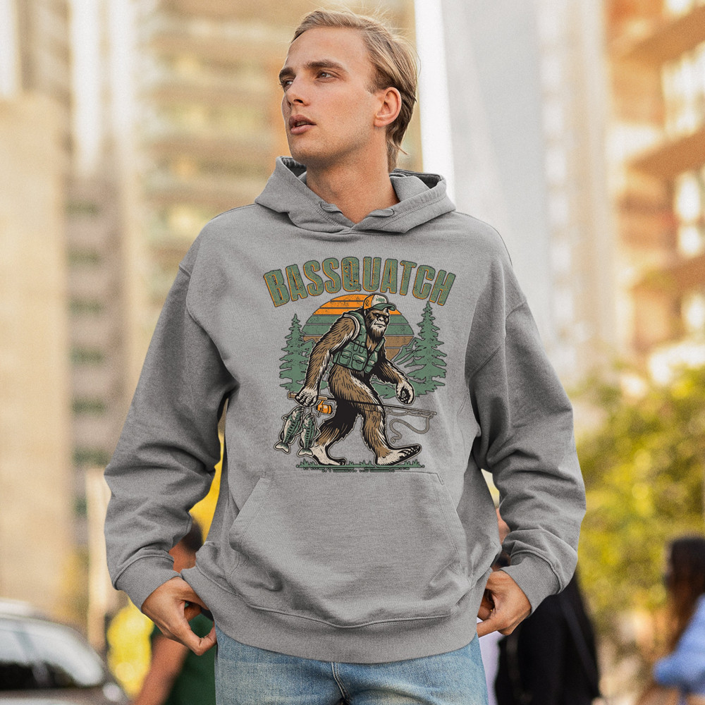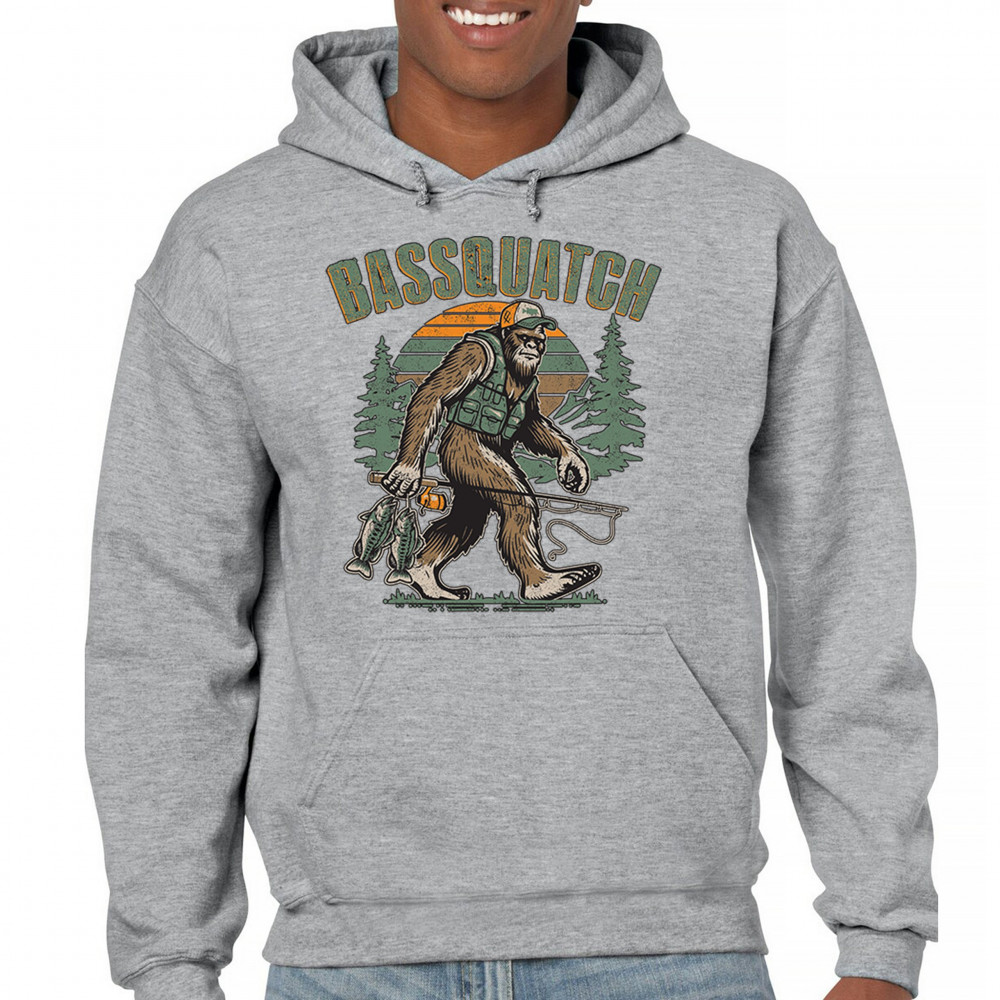 Funny Bassquatch design blends Bigfoot, fishing humor, and retro forest style. Great for anglers, cryptid lovers, and outdoorsy pun fans.