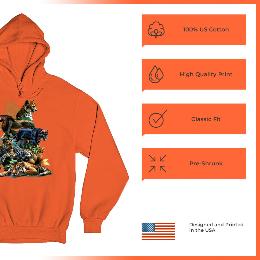 Celebrate raw power and untamed beauty with this stunning big cat design featuring lion, tiger, cheetah, black panther, jaguar, and leopard. Surrounded by vivid jungle foliage, each animal radiates strength, pride, and wild spirit. Perfect for fans of nature, safari vibes, wildlife preservation, and fierce animal energy.