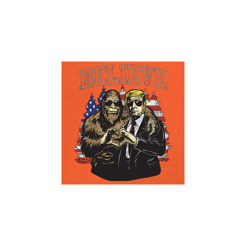 The "Believe" design combines patriotic pride and conservative values with a touch of fun. Featuring Donald J. Trump and a loyal Bigfoot against the American flag, this graphic is perfect for Trump supporters, Republicans, and believers in America First. Celebrate the Red Wave, the 47th President, and the unstoppable fight for victory. Ideal for anyone with unwavering belief in the people's mandate.