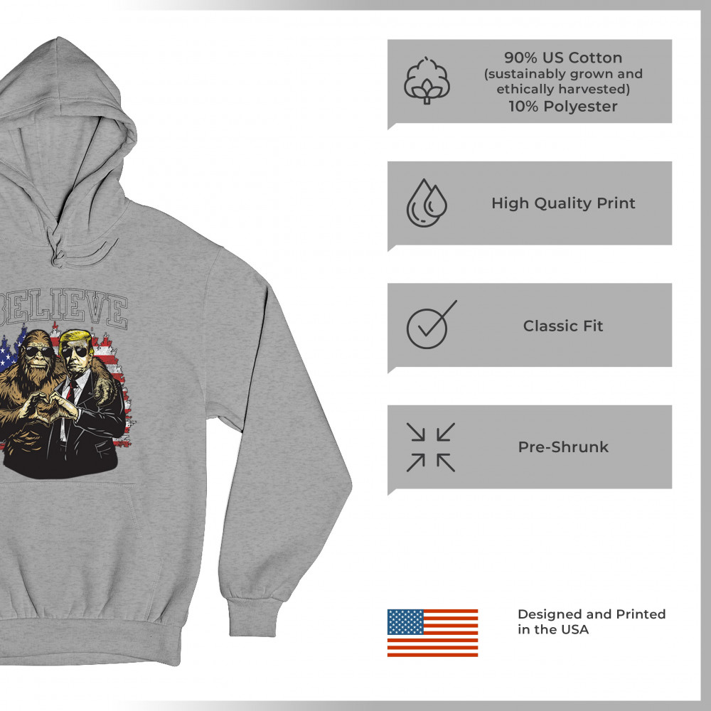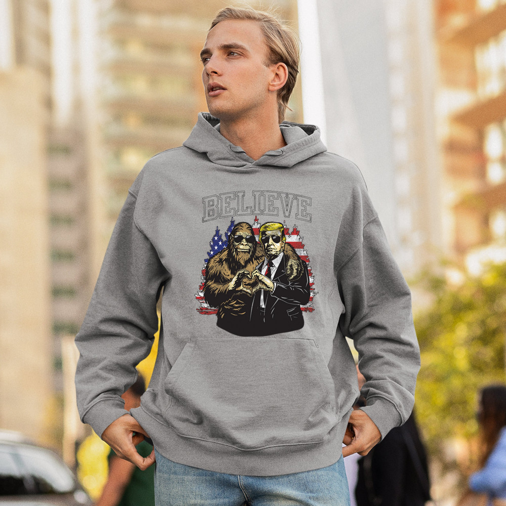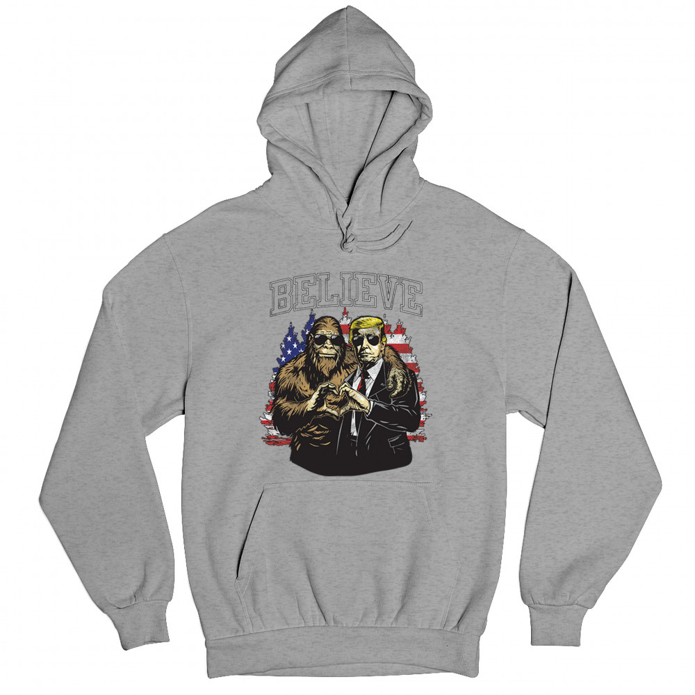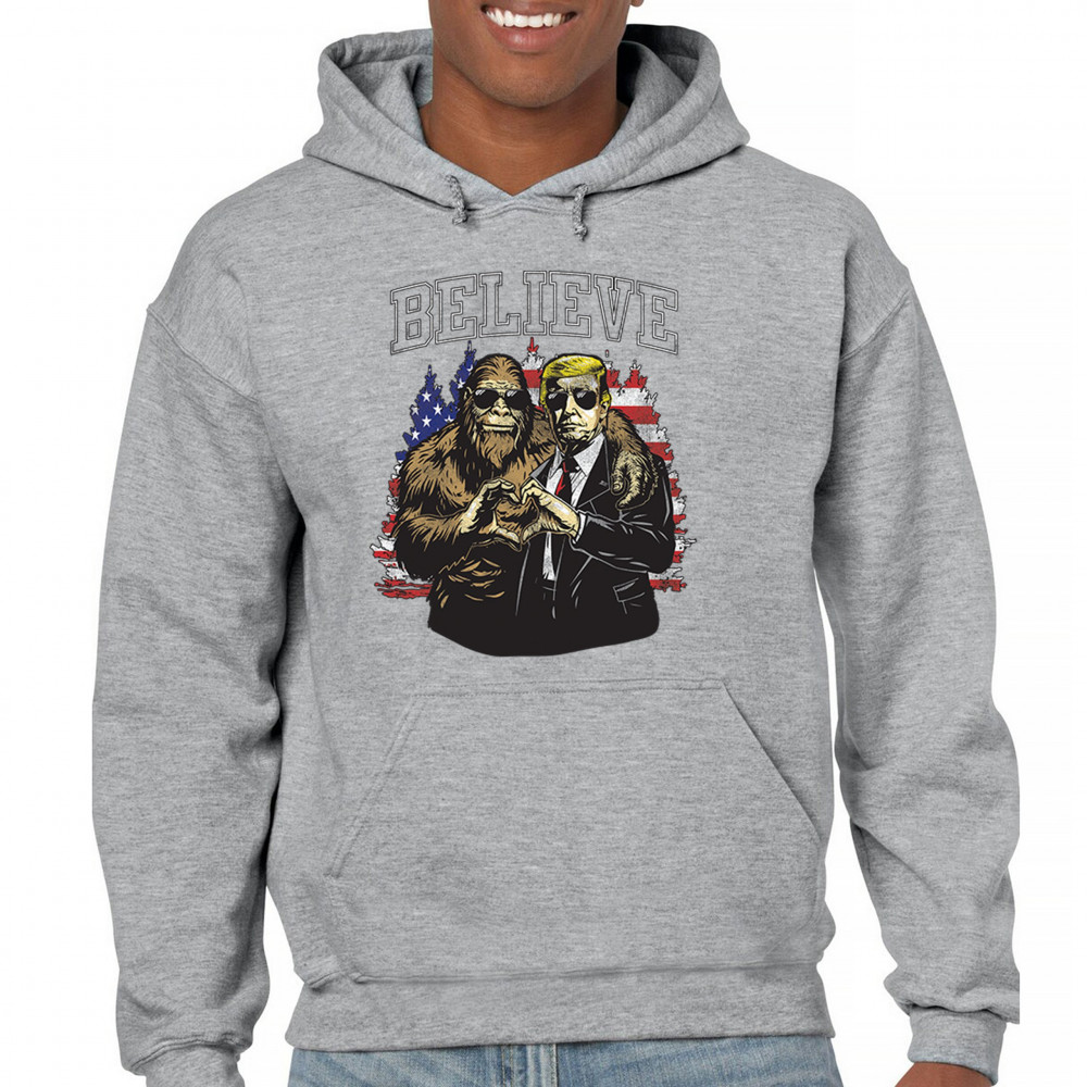 The "Believe" design combines patriotic pride and conservative values with a touch of fun. Featuring Donald J. Trump and a loyal Bigfoot against the American flag, this graphic is perfect for Trump supporters, Republicans, and believers in America First. Celebrate the Red Wave, the 47th President, and the unstoppable fight for victory. Ideal for anyone with unwavering belief in the people's mandate.