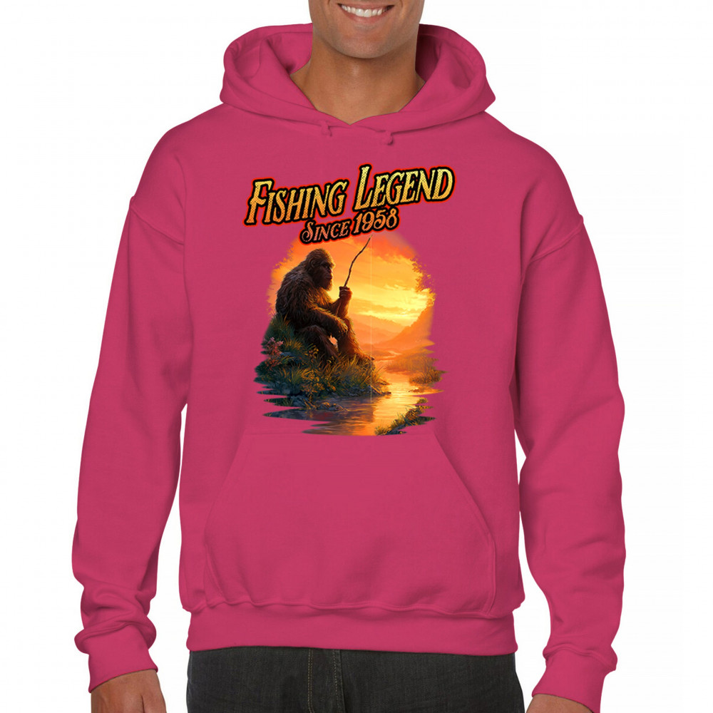 Bigfoot fishing legend design with Sasquatch lifestyle, retro vintage humor, funny wilderness shirt, Father’s Day gift, and campfire style.