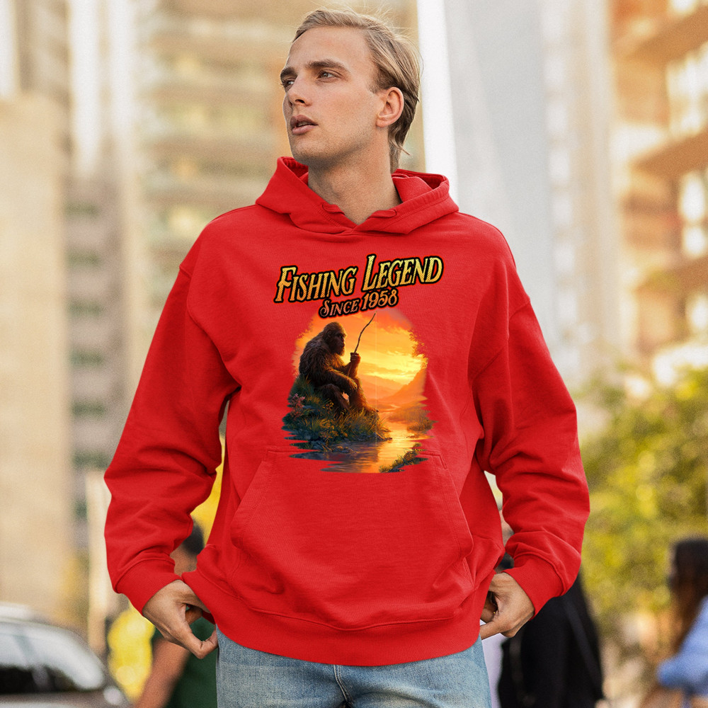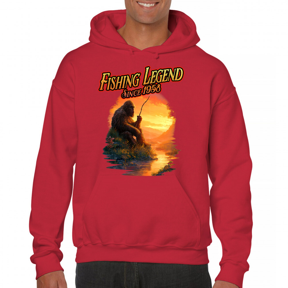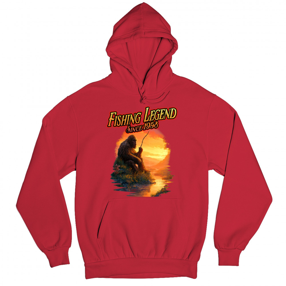 Bigfoot fishing legend design with Sasquatch lifestyle, retro vintage humor, funny wilderness shirt, Father’s Day gift, and campfire style.