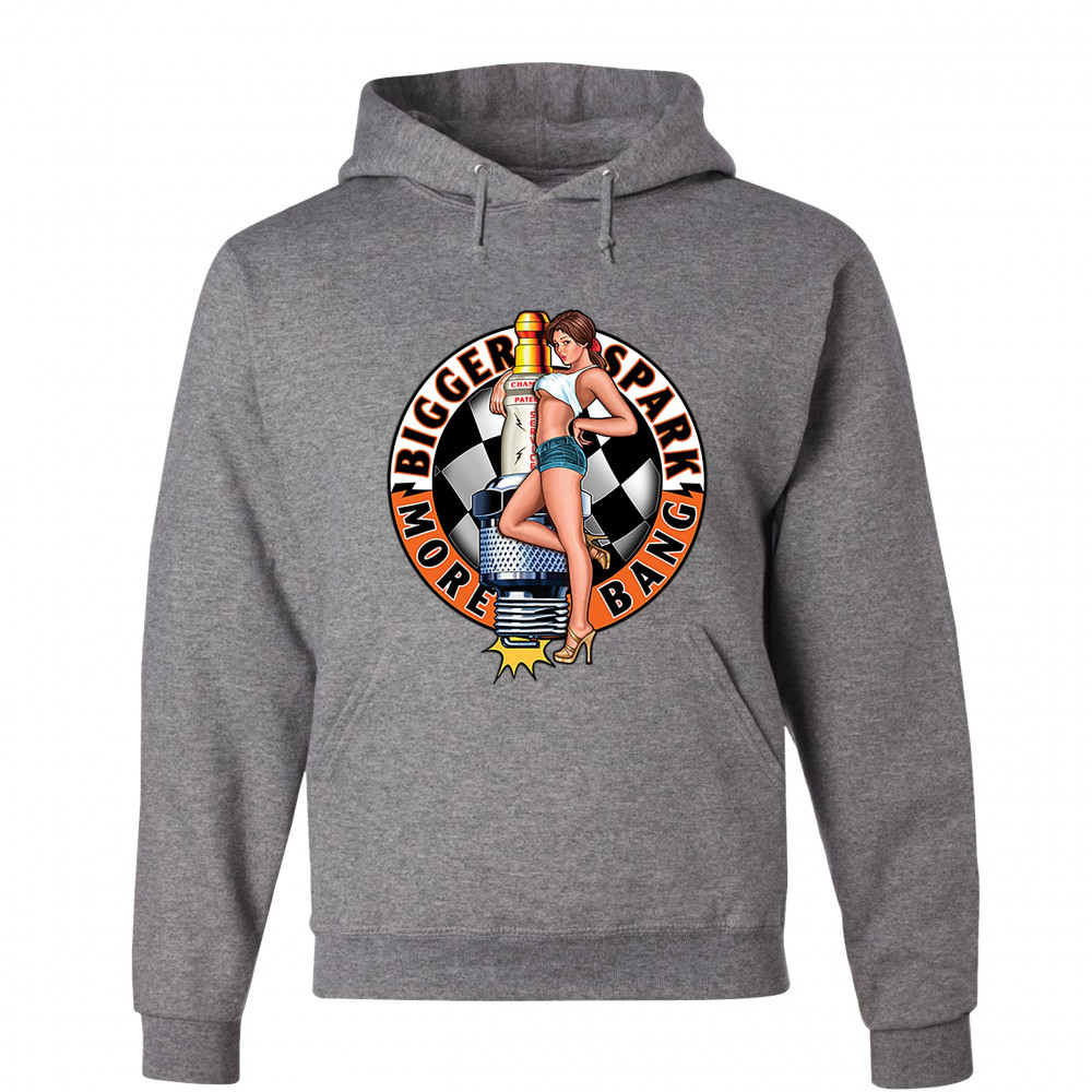 BIGGER SPARK MORE BANG sweatshirt pin-up girl vintage automotive hoodie gray