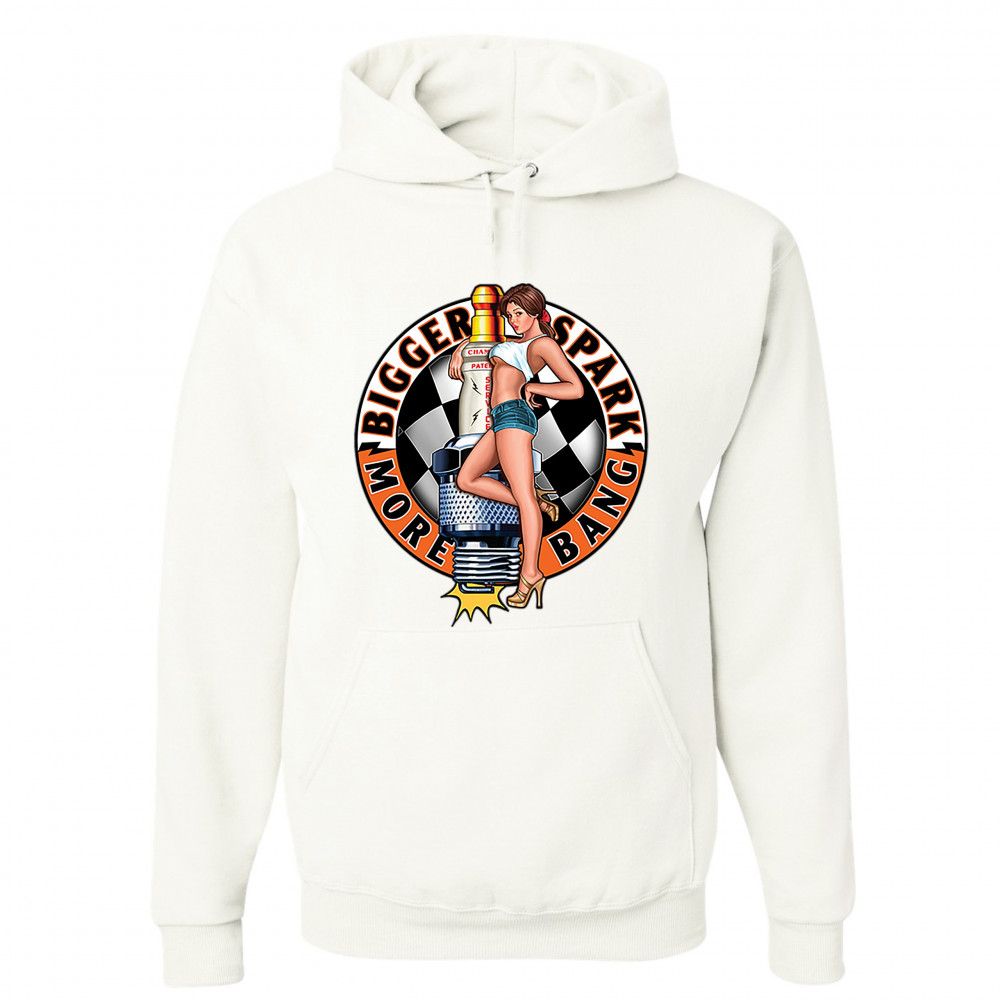 BIGGER SPARK MORE BANG sweatshirt pin-up girl vintage automotive hoodie white