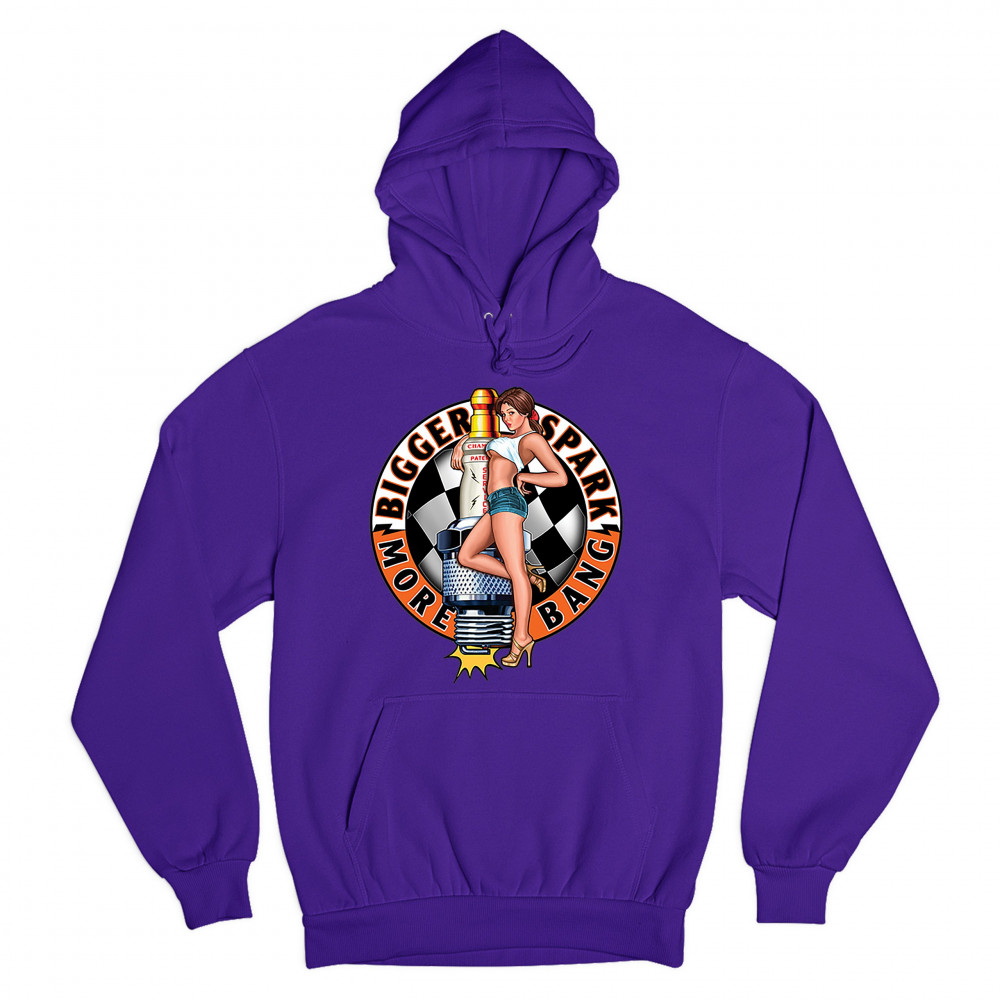 BIGGER SPARK MORE BANG sweatshirt pin-up girl vintage automotive hoodie purple