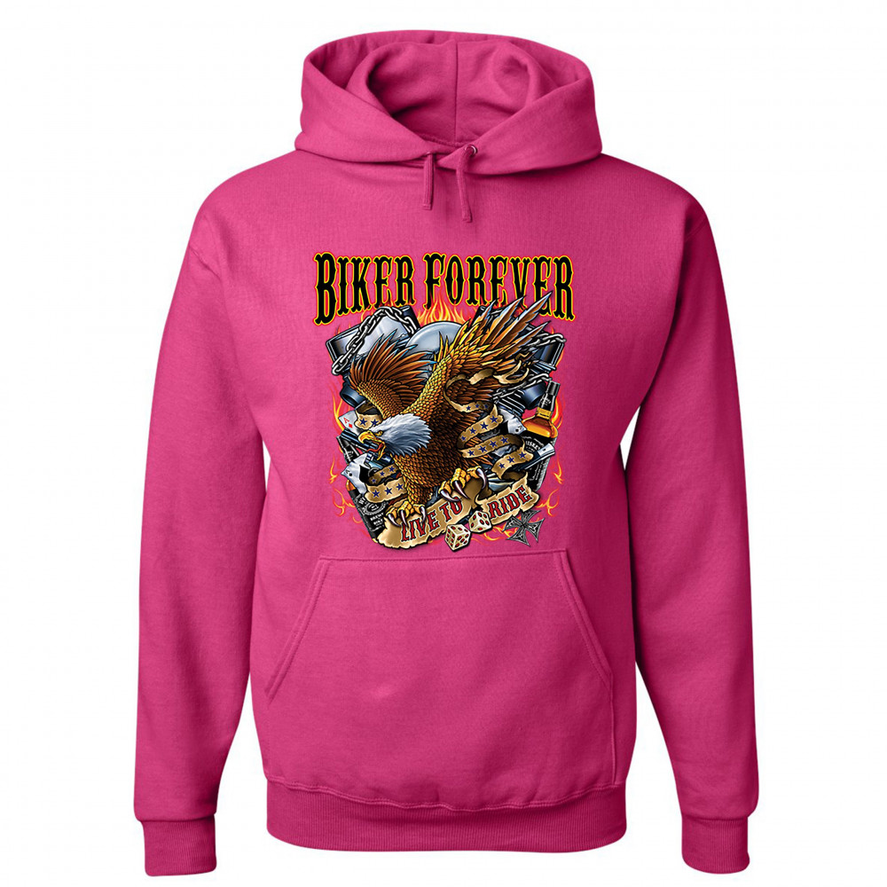 A print featuring an American bald eagle, holding a stripe with "live to ride" written on it, a v-engine in the background, a pair of dice and playing cards. At the top the print says: "biker forever". A great choice for a motorcycle enthusiast.