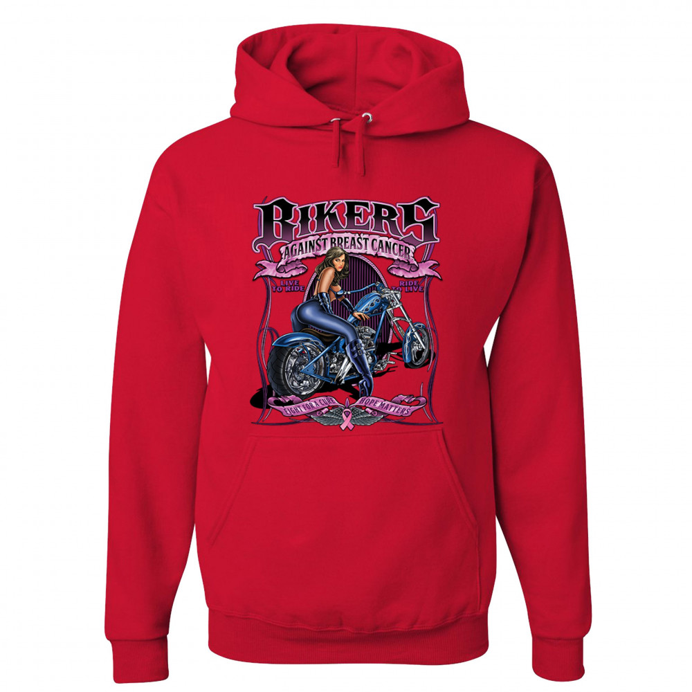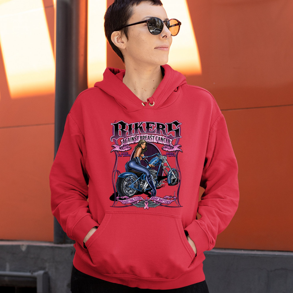 A print featuring a badass biker chick leaning on a chopper. The print says: "Bikers against breast cancer. Live to ride. Ride to live." At the bottom of the print there are two stripes with "fight for a cure, hope matters" written on them. Between the st