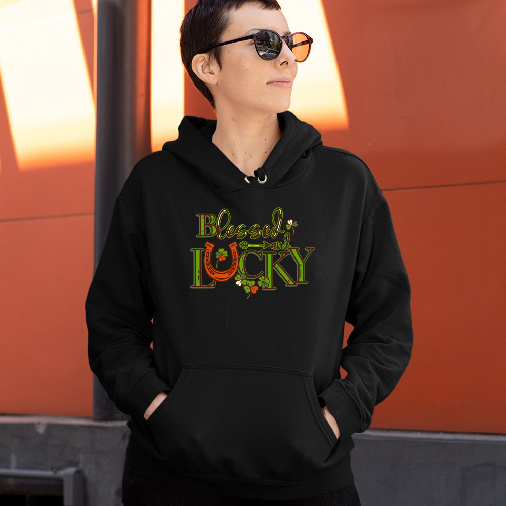 BLESSED AND LUCKY sweatshirt st. patrick's day clover irish malarkey hoodie black