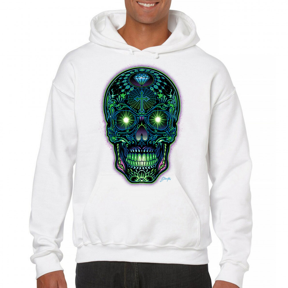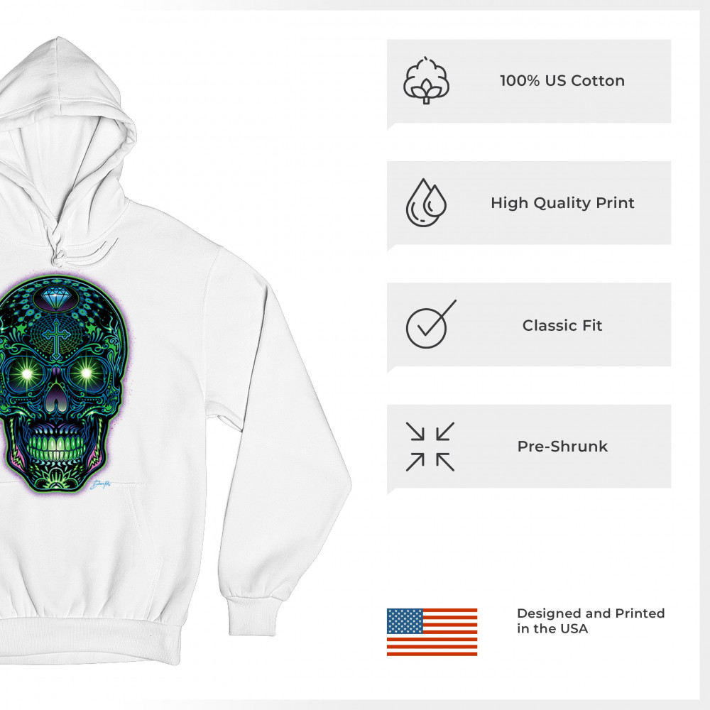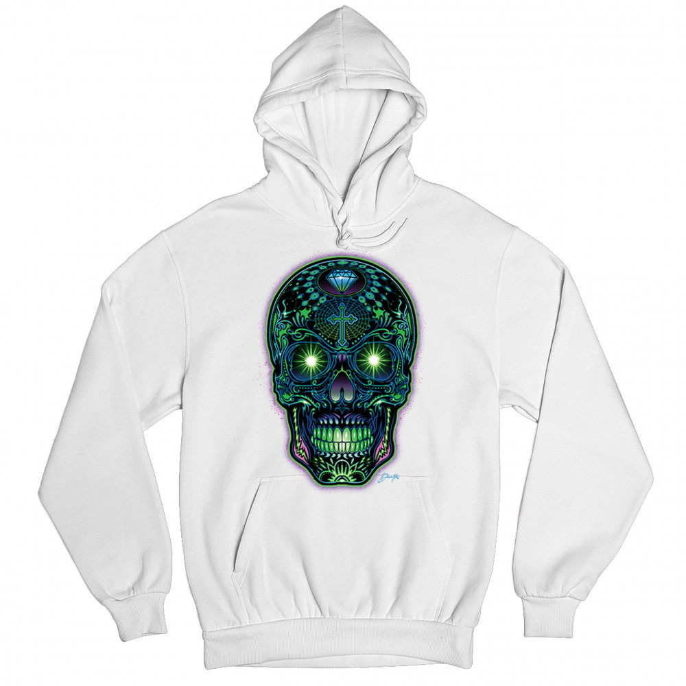 This electrified sugar skull design glows with neon energy and intricate details. Featuring green eyes, radiant cross, diamond, spider web, and vivid colors, it's a bold mash-up of psychedelic art, Day of the Dead tradition, and rave culture. A vibrant design perfect for skull fans and spiritual rebels alike.