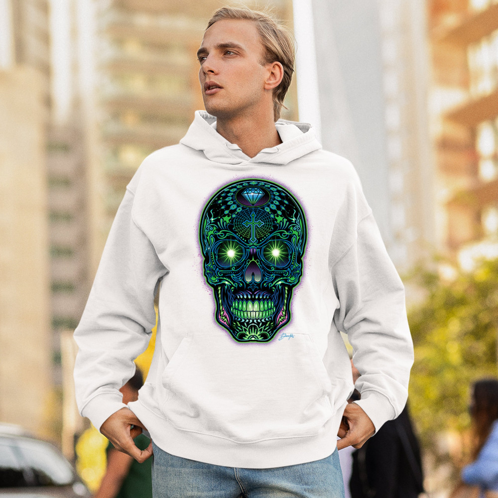 Electrified sugar skull with glowing green eyes, neon cross and diamond, perfect for rave lovers, skull art fans, and Day of the Dead style.