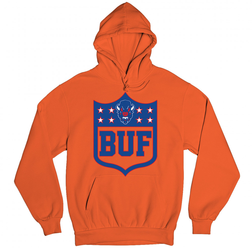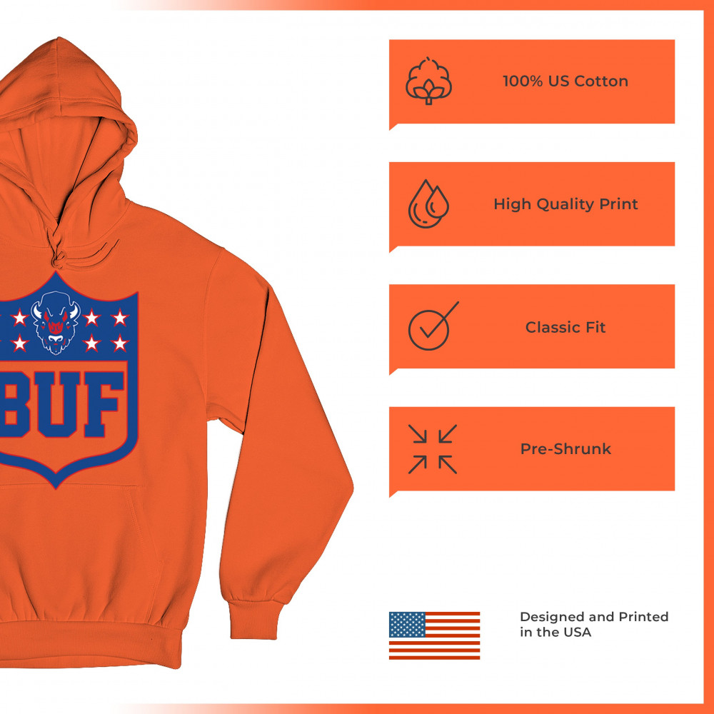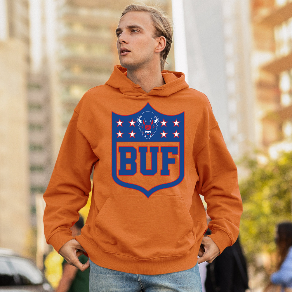 Bold Buffalo bison shield design for game day gear, tailgating, Sunday football, and championship pride in The Queen City.