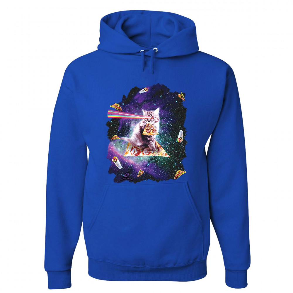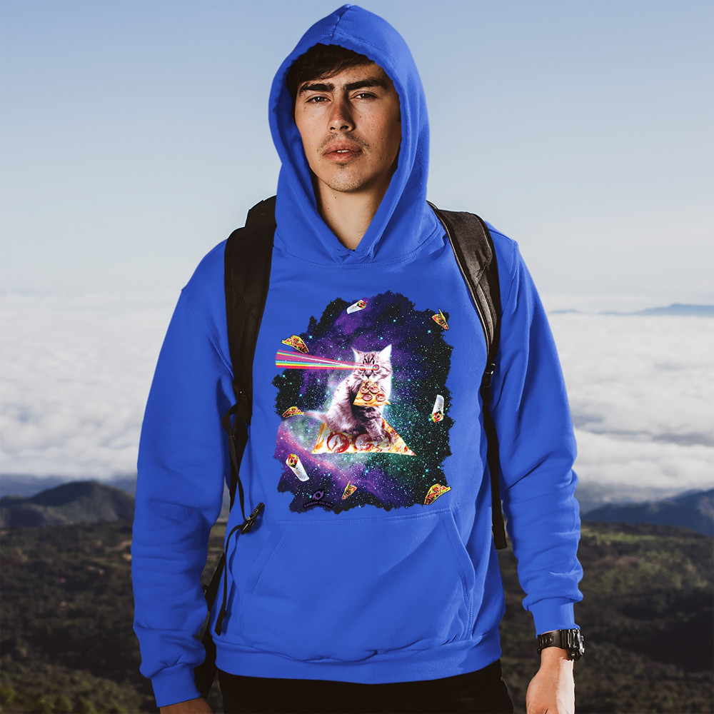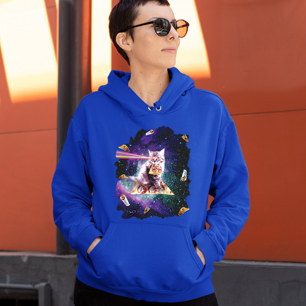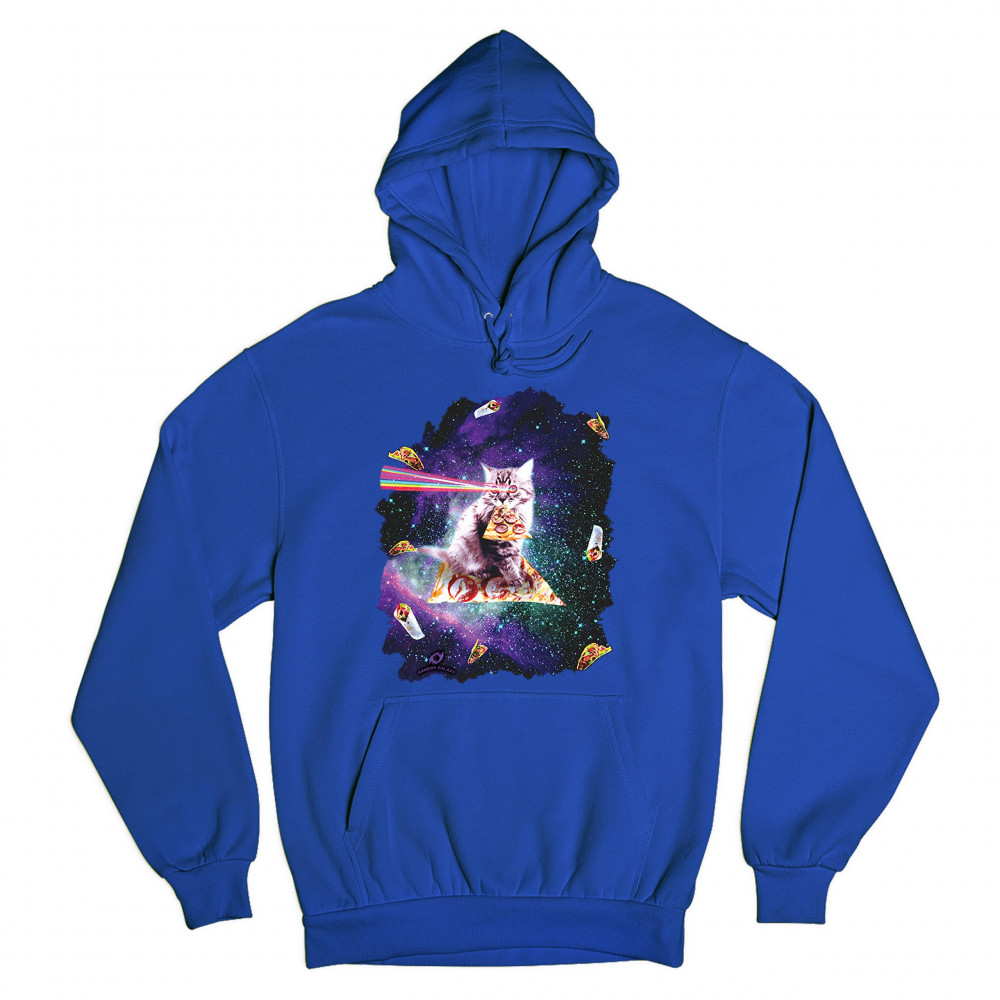 CAT FIRING RAINBOW LASER RIDING PIZZA SLICE IN SPACE sweatshirt weird hoodie royal blue