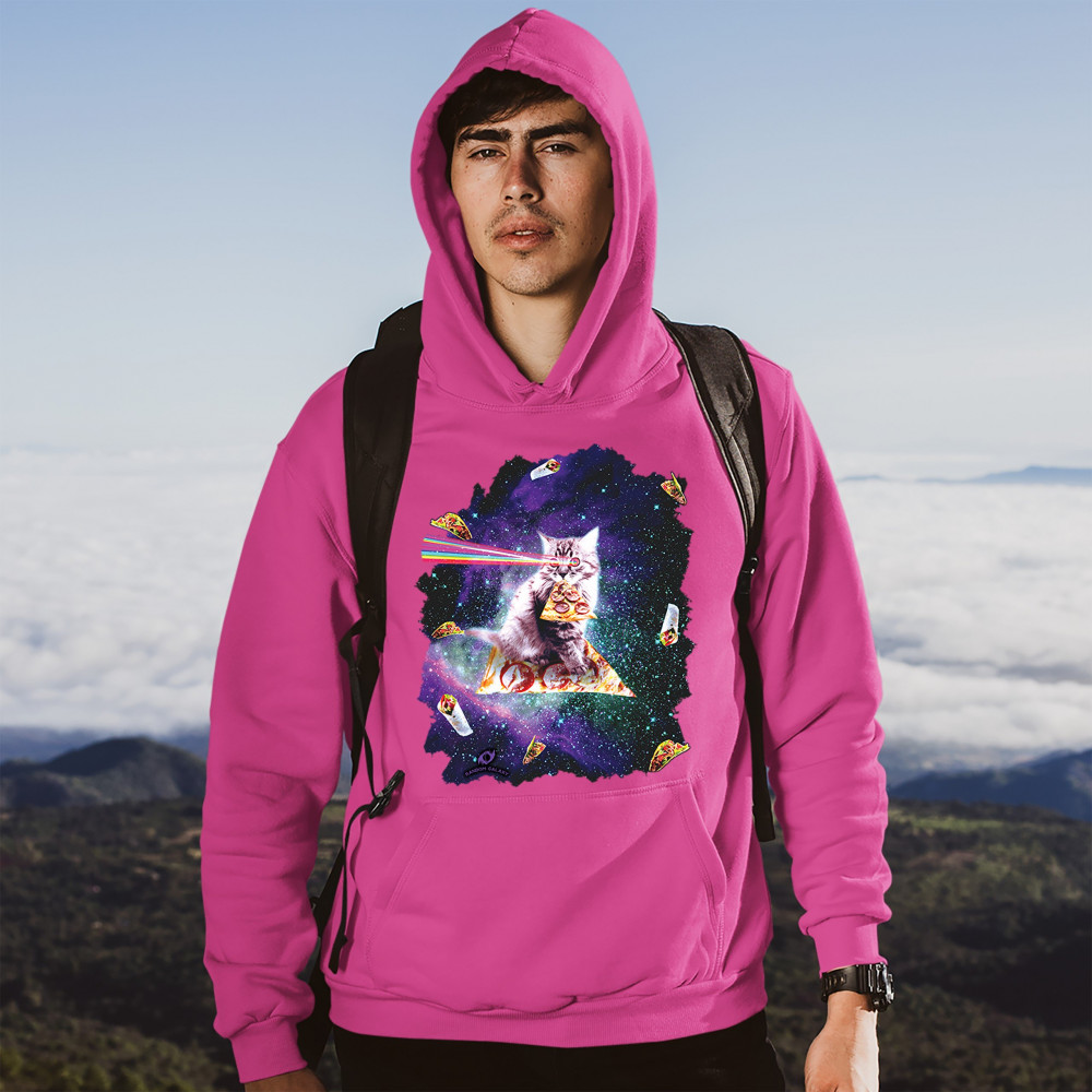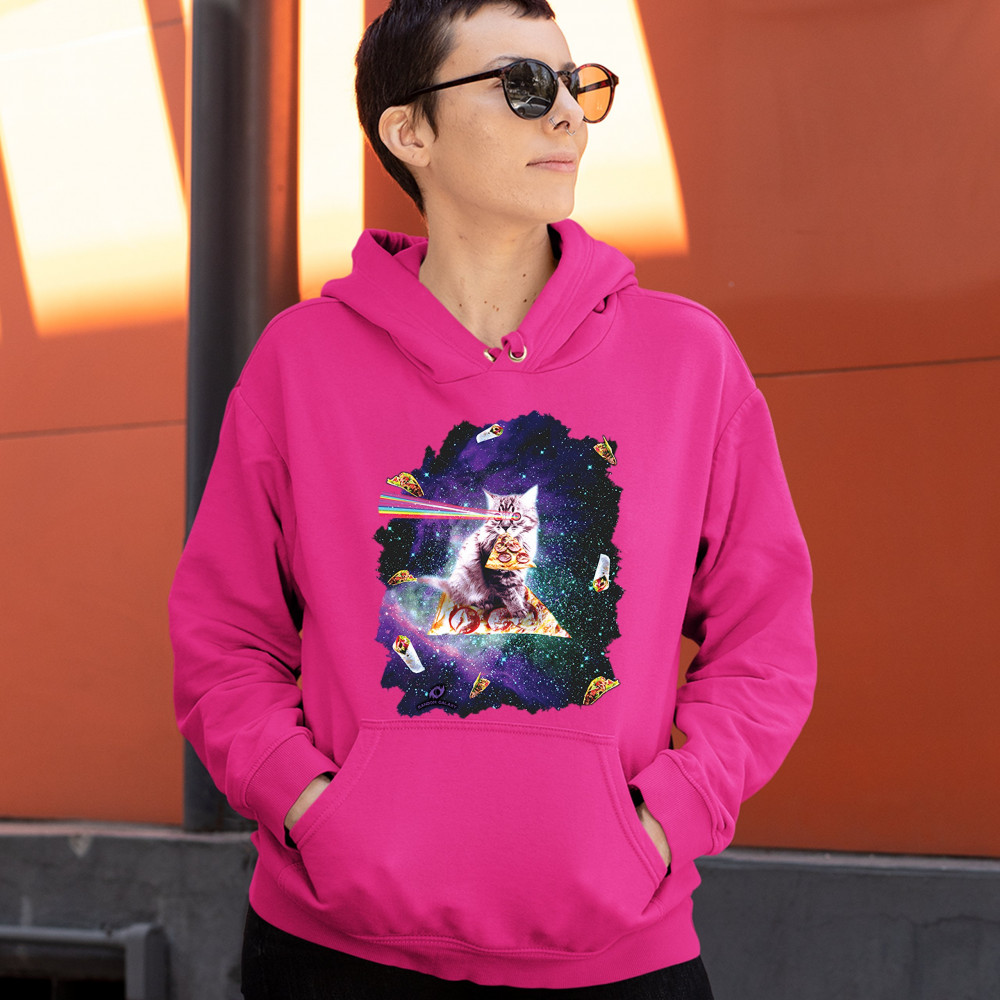 A print featuring a cat flying through space on a slice of pizza holding another slice in it's mouth while firing rainbow lasers from it's eyes. The cat is surrounded by burritos and shawarmas. A great choice for anyone who is into cats, space and weird s