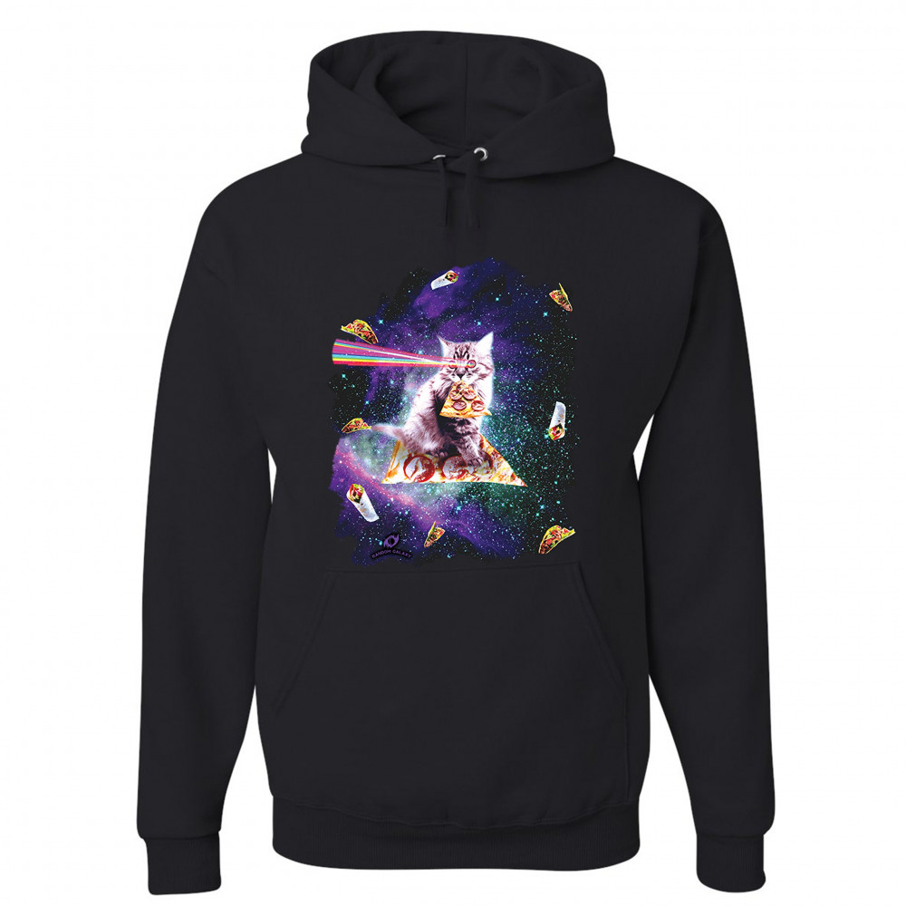 A print featuring a cat flying through space on a slice of pizza holding another slice in it's mouth while firing rainbow lasers from it's eyes. The cat is surrounded by burritos and shawarmas. A great choice for anyone who is into cats, space and weird s