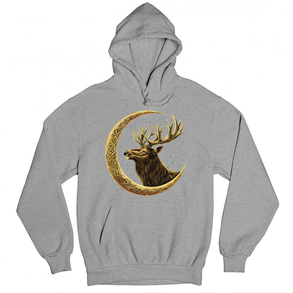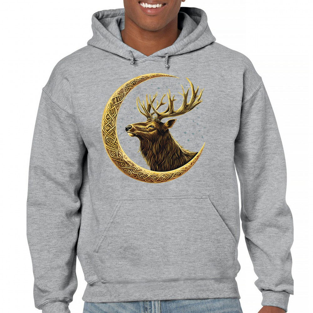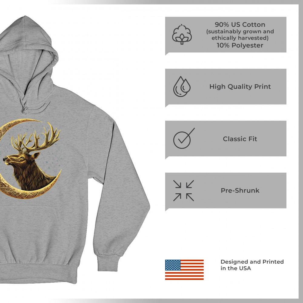 Celtic stag design with golden moon and cosmic stars. Symbolizes forest strength, leadership, and spiritual energy. Perfect for nature lovers.