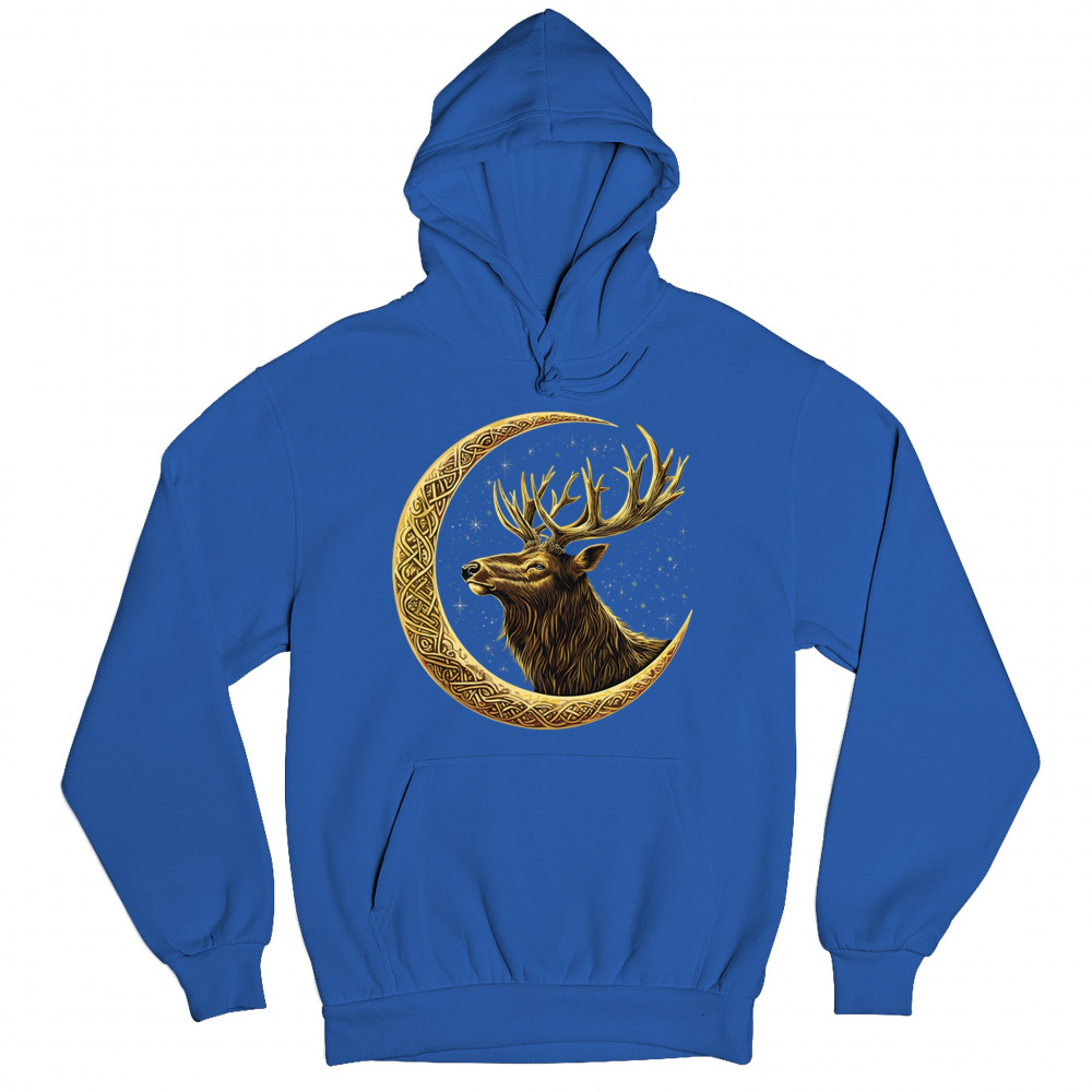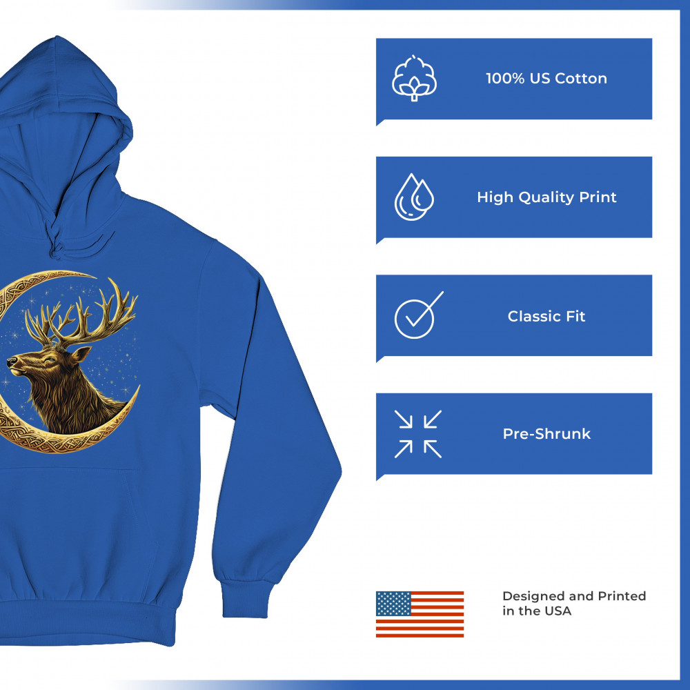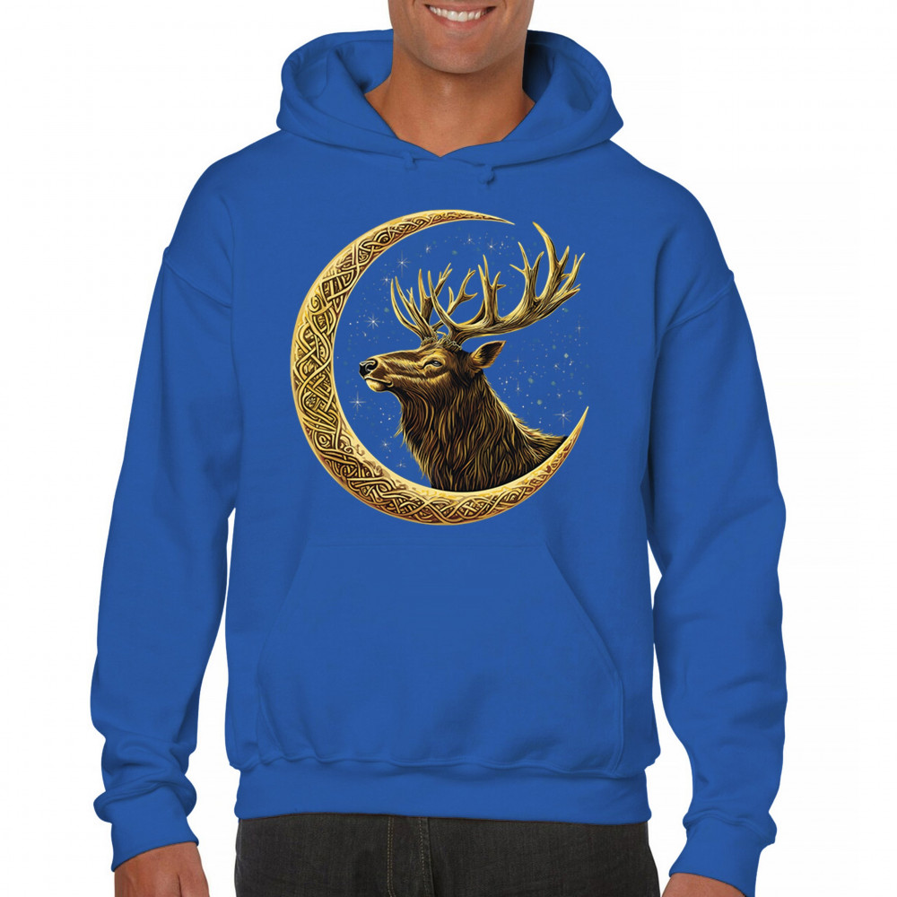 Celtic stag design with golden moon and cosmic stars. Symbolizes forest strength, leadership, and spiritual energy. Perfect for nature lovers.