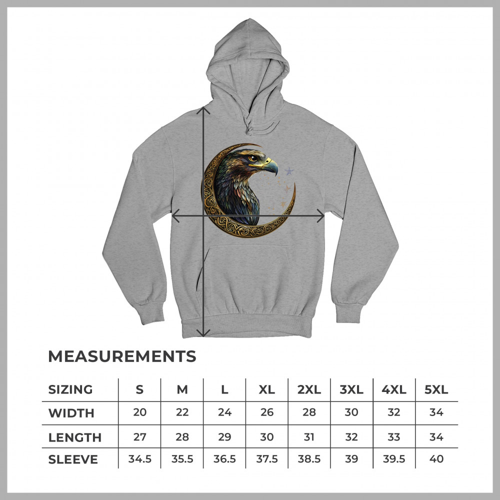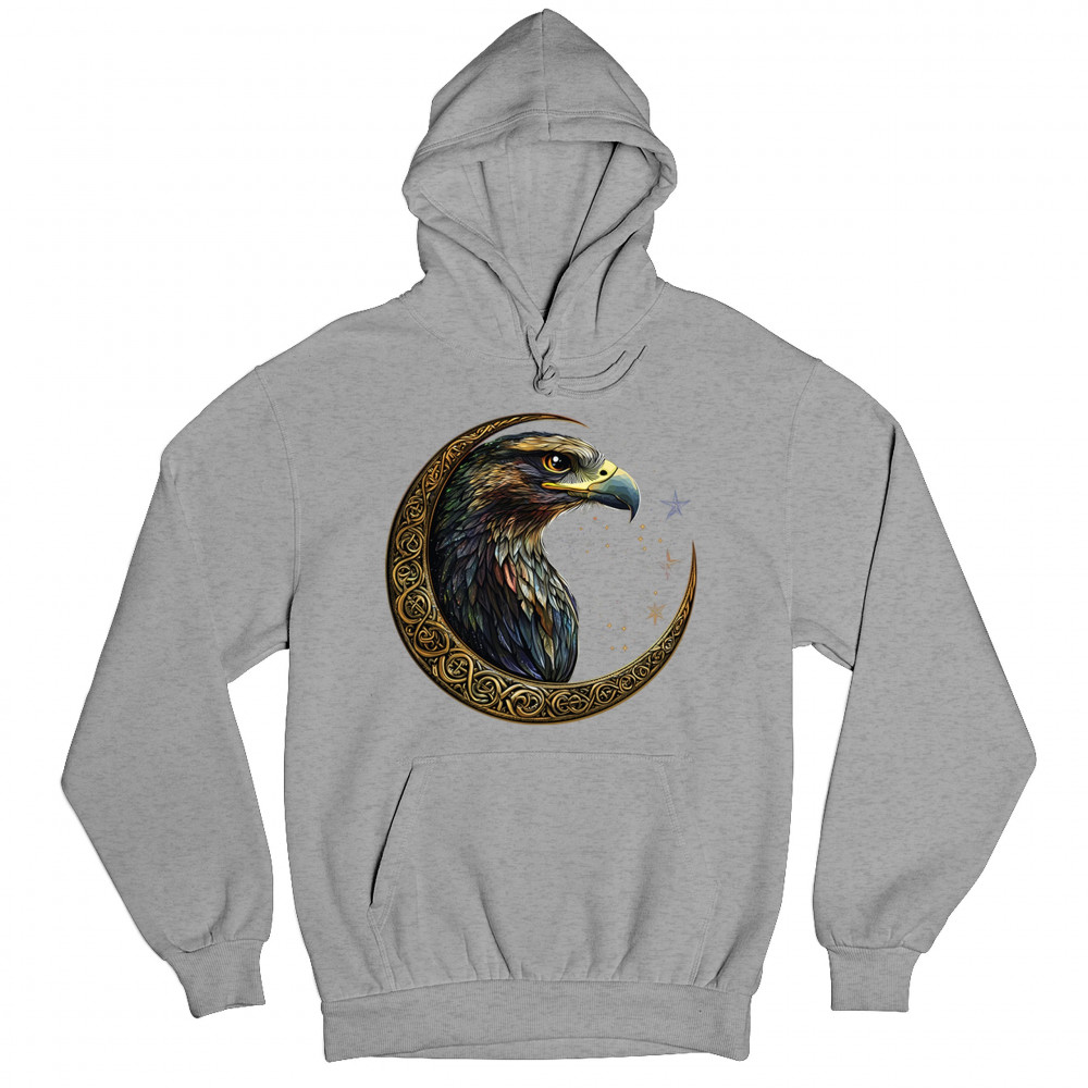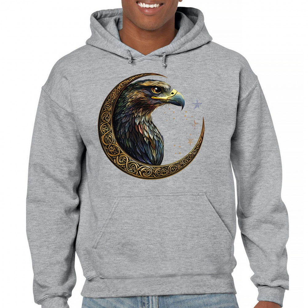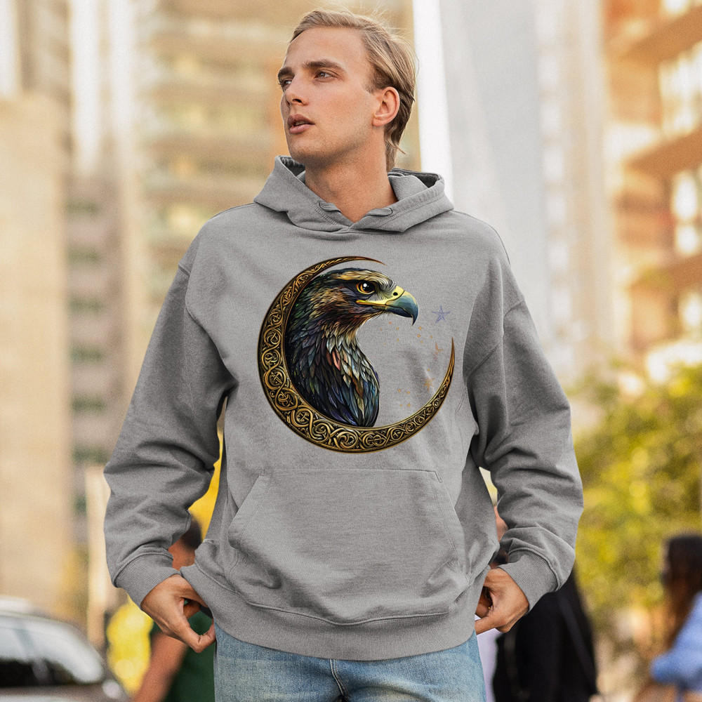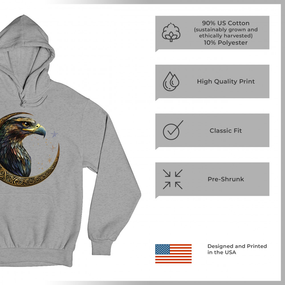 A beautifully detailed eagle with vibrant feathers is framed by a golden Celtic crescent moon and surrounded by a starry cosmic sky. This striking design represents freedom, spiritual power, and the mystery of the skies. Perfect for patriots, bird lovers, and those who connect with nature, tribal symbolism, and celestial art.