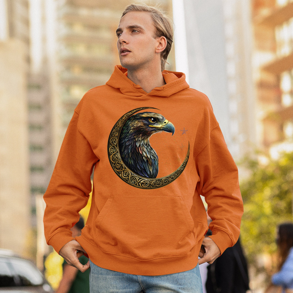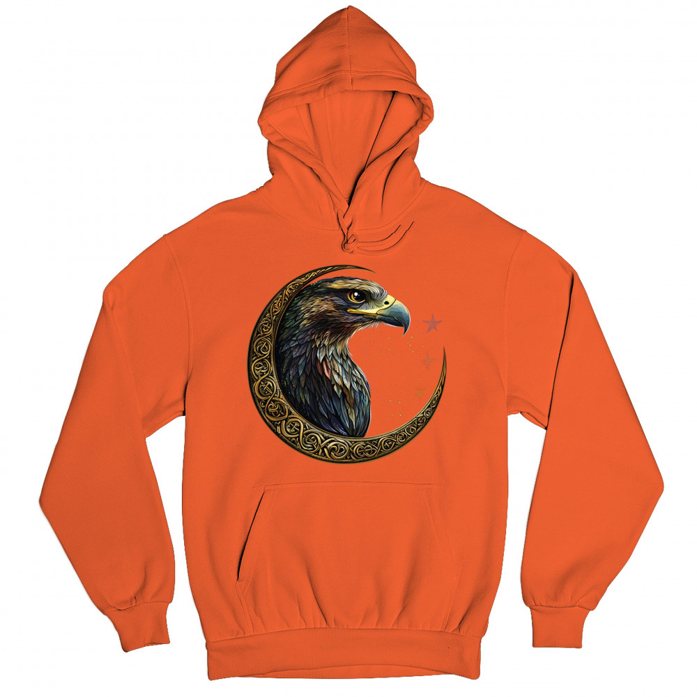 A beautifully detailed eagle with vibrant feathers is framed by a golden Celtic crescent moon and surrounded by a starry cosmic sky. This striking design represents freedom, spiritual power, and the mystery of the skies. Perfect for patriots, bird lovers, and those who connect with nature, tribal symbolism, and celestial art.