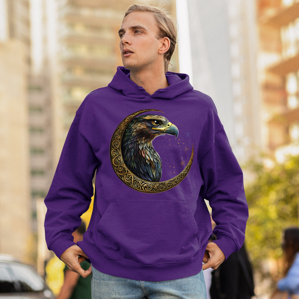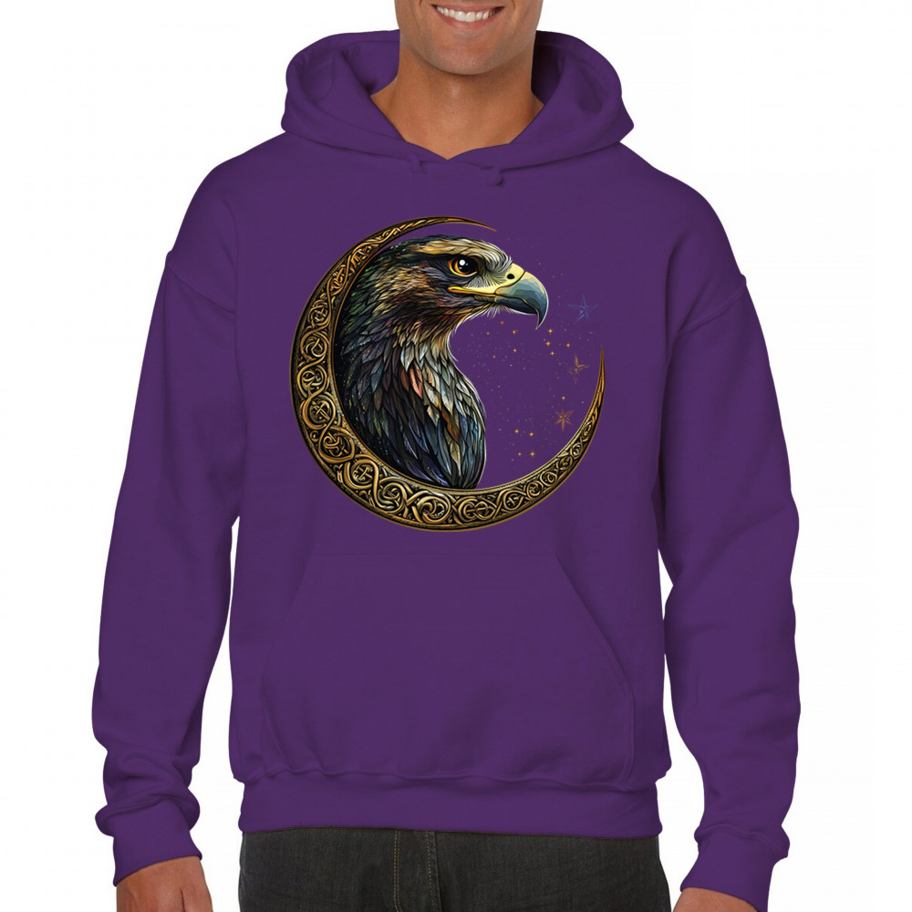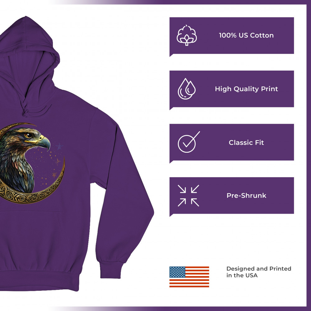 A beautifully detailed eagle with vibrant feathers is framed by a golden Celtic crescent moon and surrounded by a starry cosmic sky. This striking design represents freedom, spiritual power, and the mystery of the skies. Perfect for patriots, bird lovers, and those who connect with nature, tribal symbolism, and celestial art.