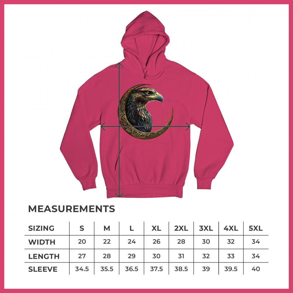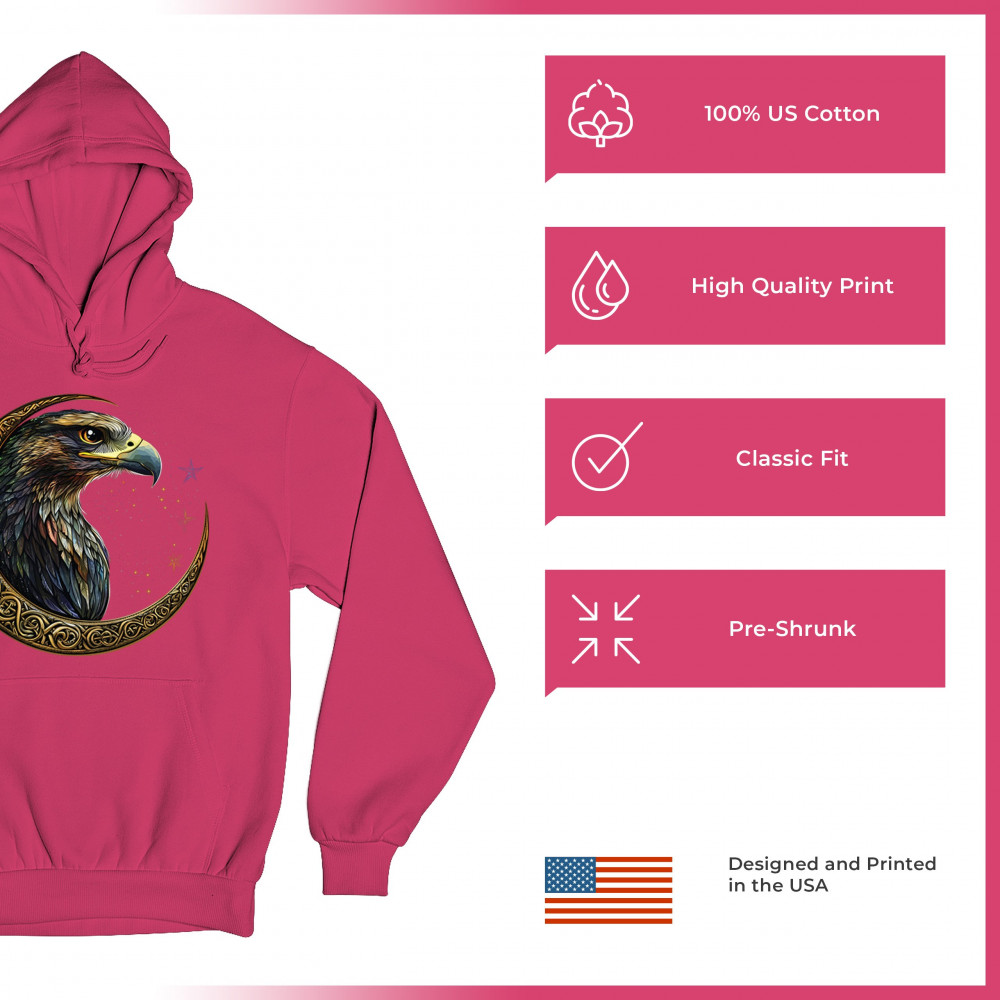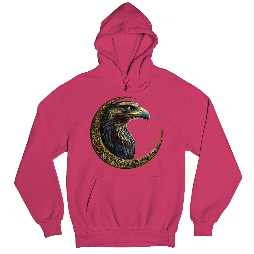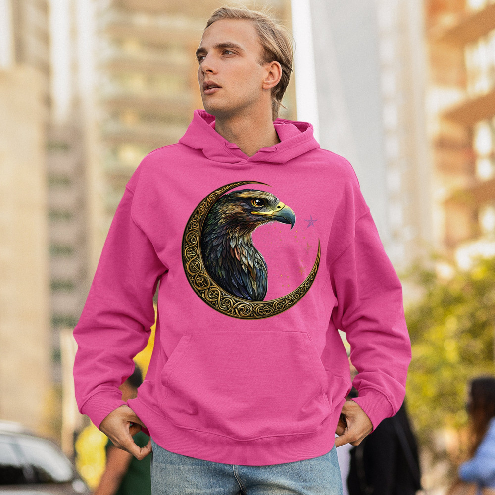 A beautifully detailed eagle with vibrant feathers is framed by a golden Celtic crescent moon and surrounded by a starry cosmic sky. This striking design represents freedom, spiritual power, and the mystery of the skies. Perfect for patriots, bird lovers, and those who connect with nature, tribal symbolism, and celestial art.