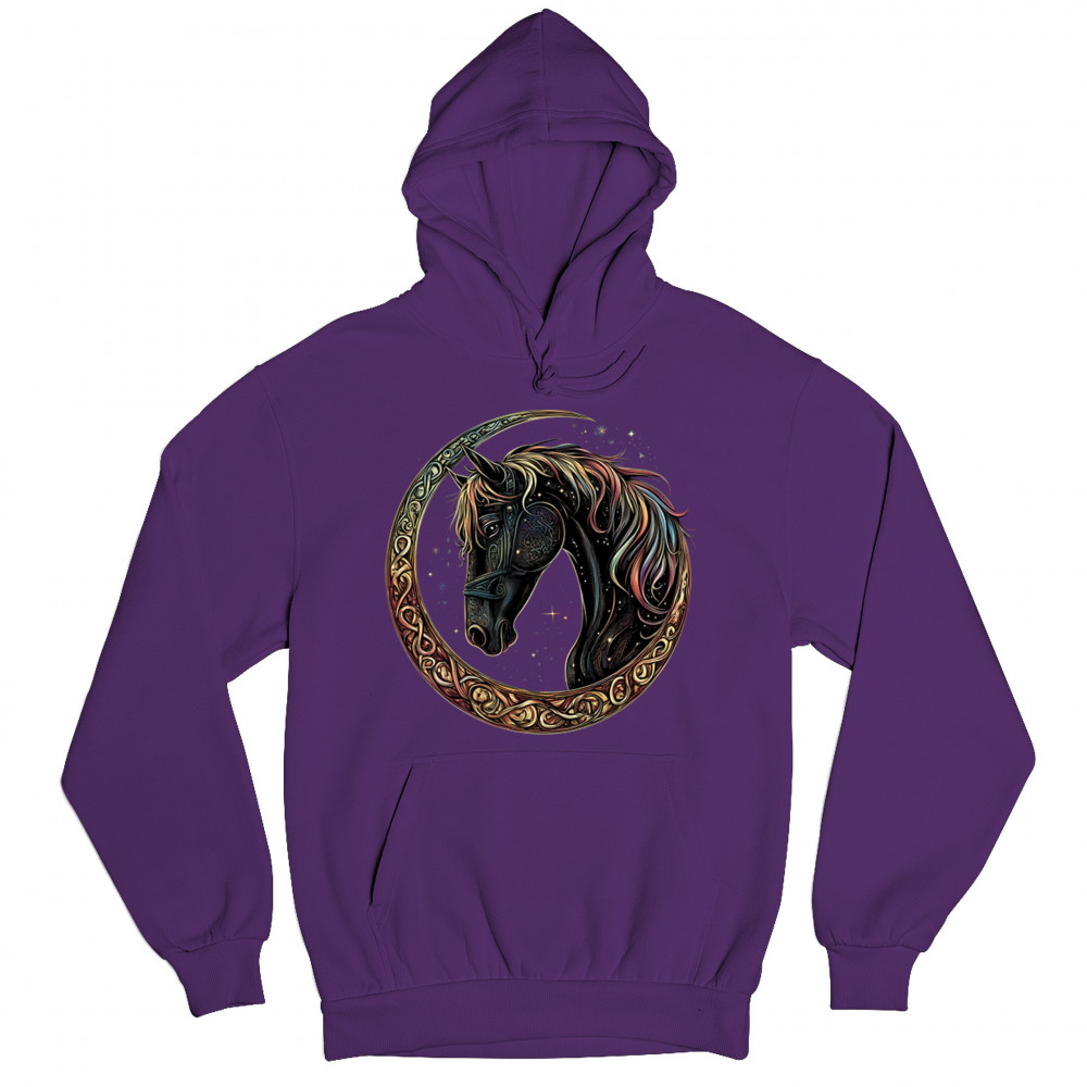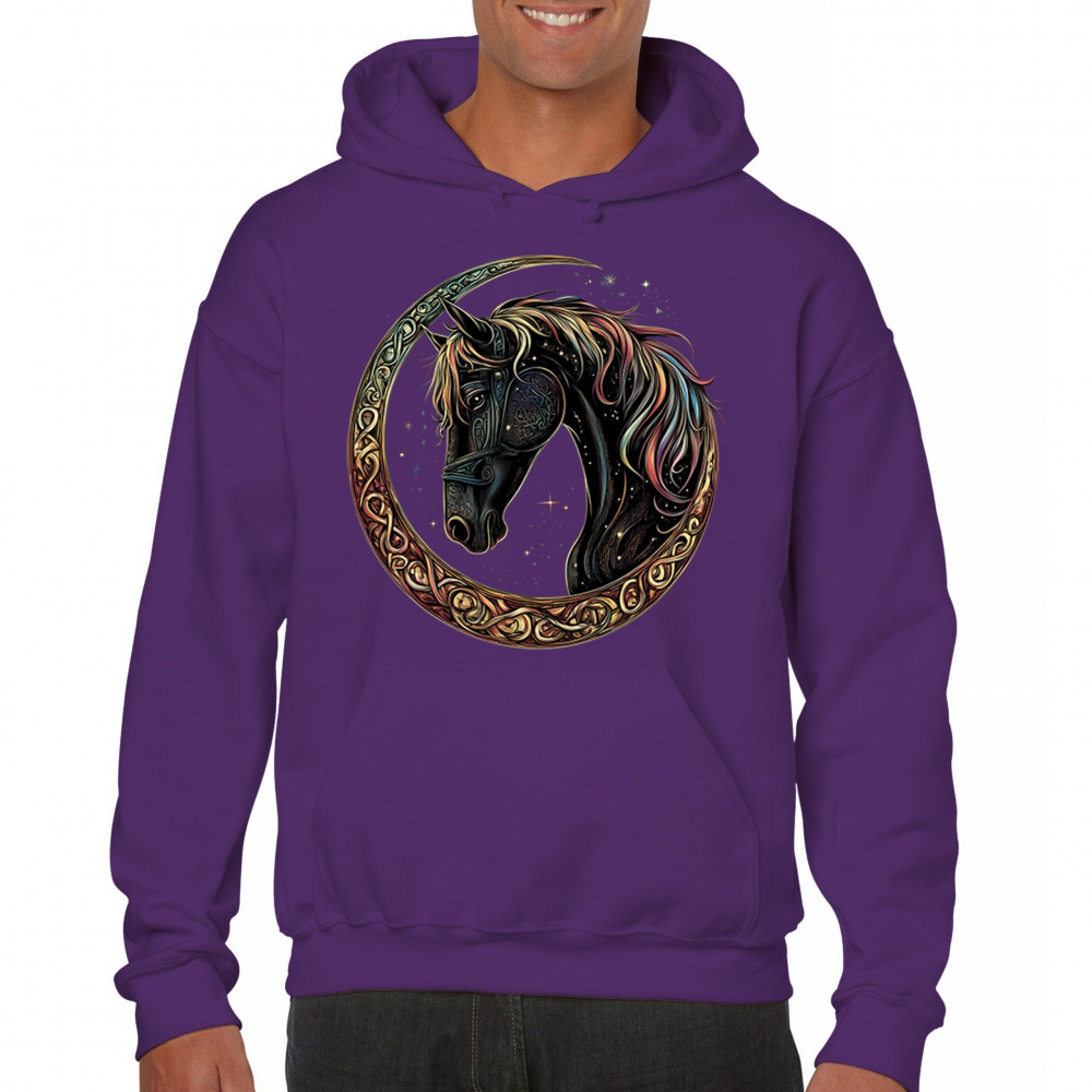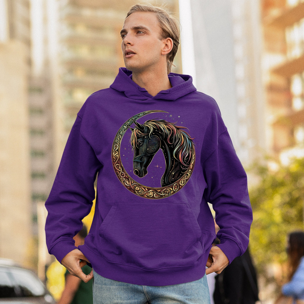Celebrate the power and grace of the cosmos with this majestic black horse framed by a golden Celtic crescent moon. Its rainbow mane and celestial body symbolize strength, movement, mystery, and spiritual magic. A stunning piece for fantasy fans, equestrians, and dreamers who love horses and stars.