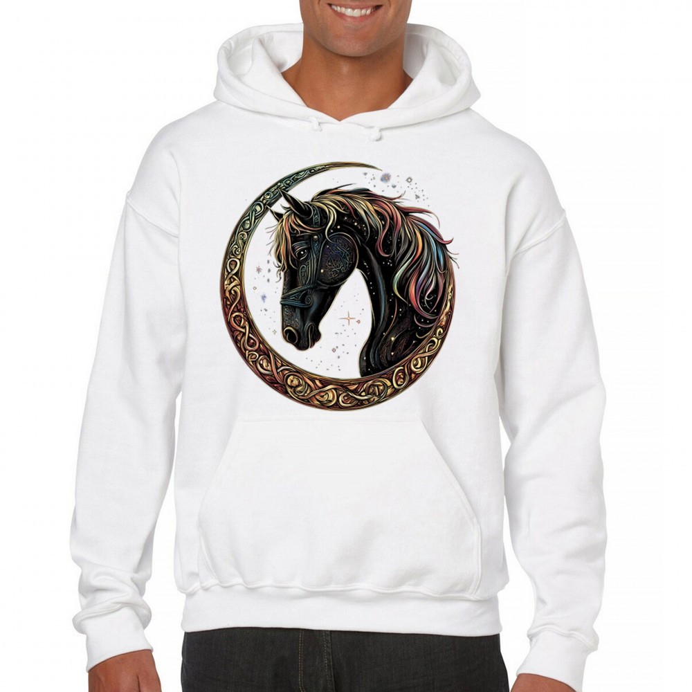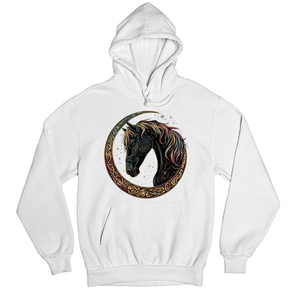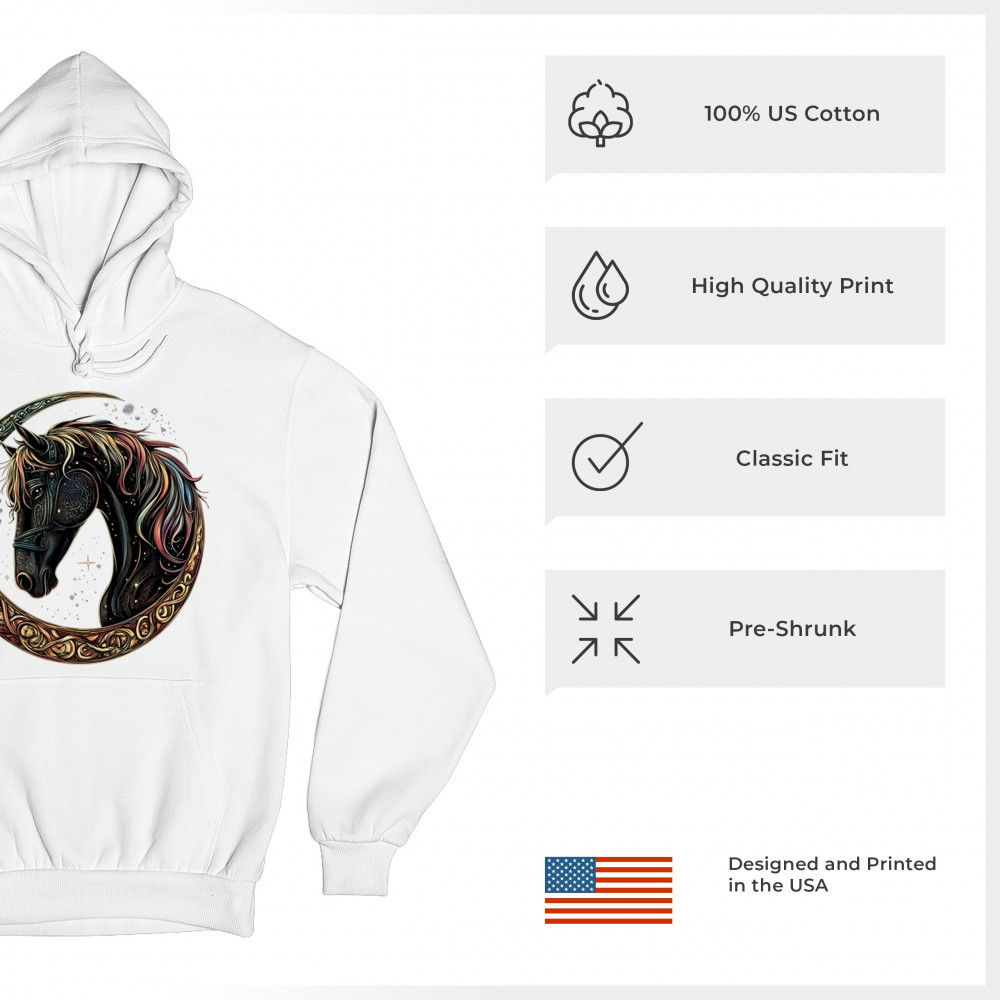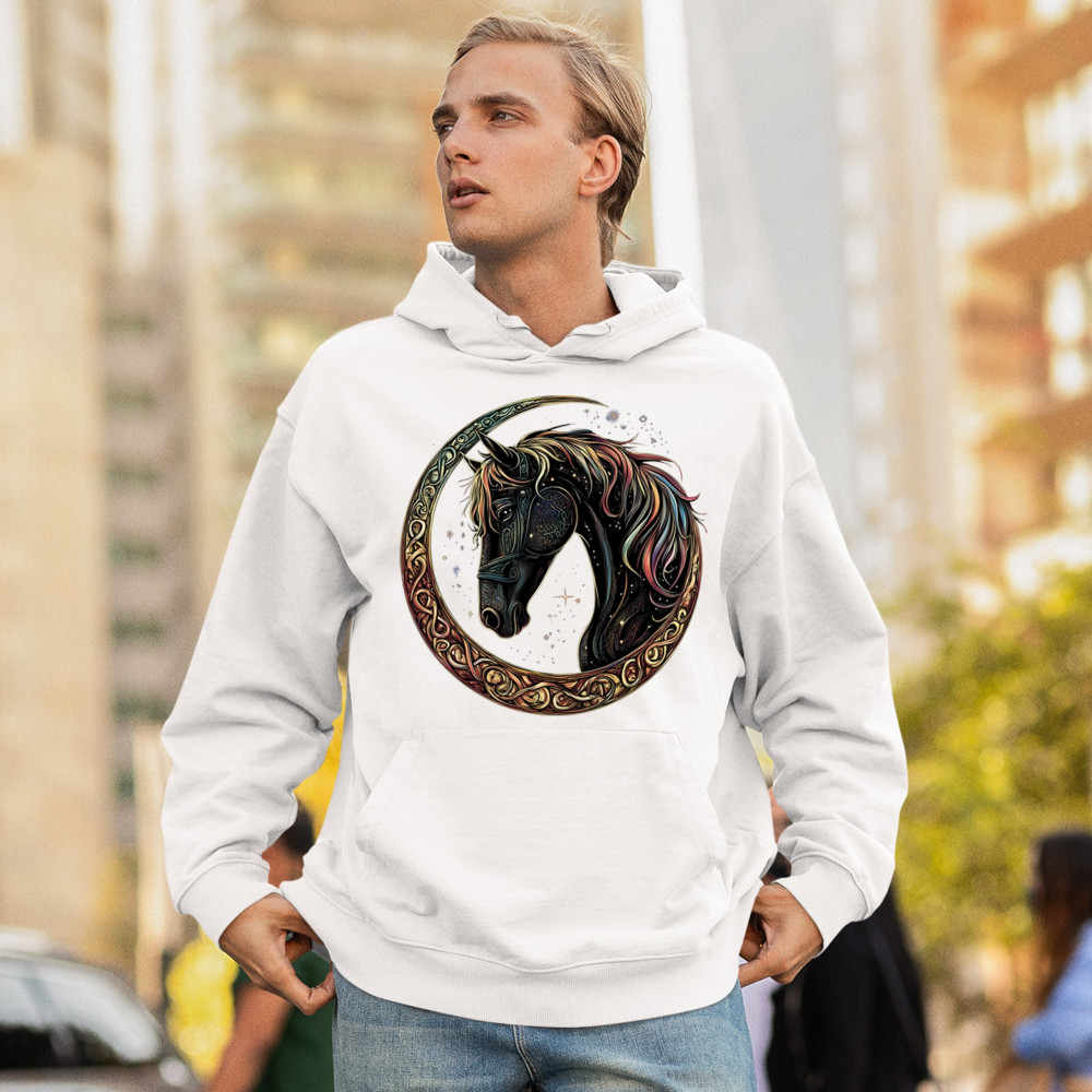 Celebrate the power and grace of the cosmos with this majestic black horse framed by a golden Celtic crescent moon. Its rainbow mane and celestial body symbolize strength, movement, mystery, and spiritual magic. A stunning piece for fantasy fans, equestrians, and dreamers who love horses and stars.