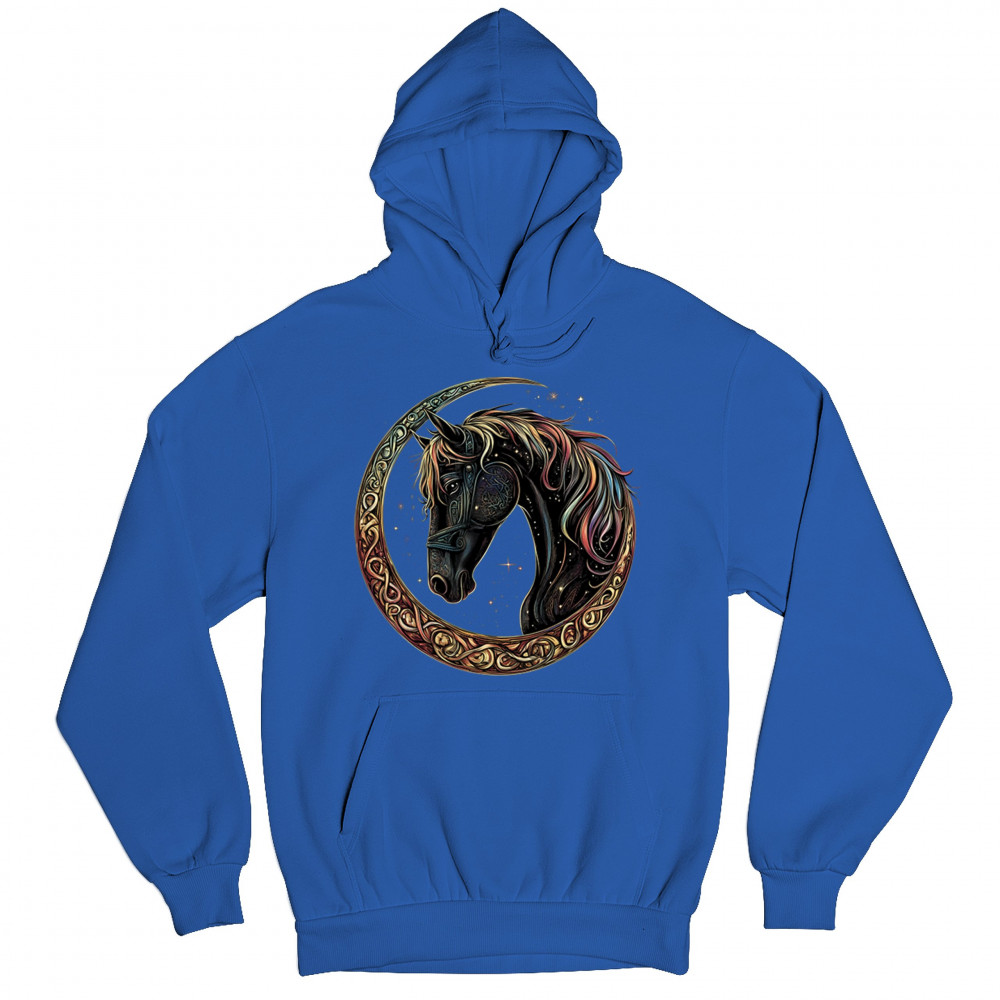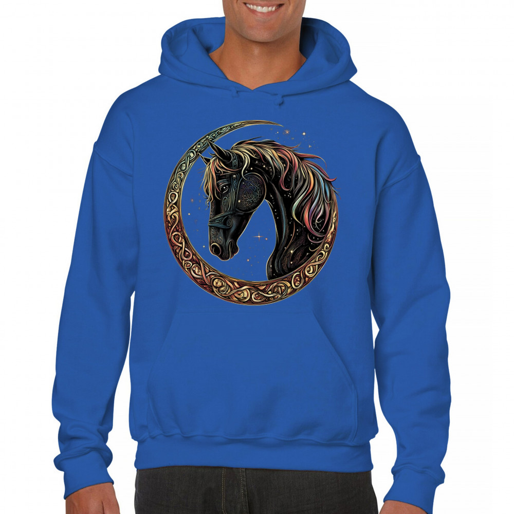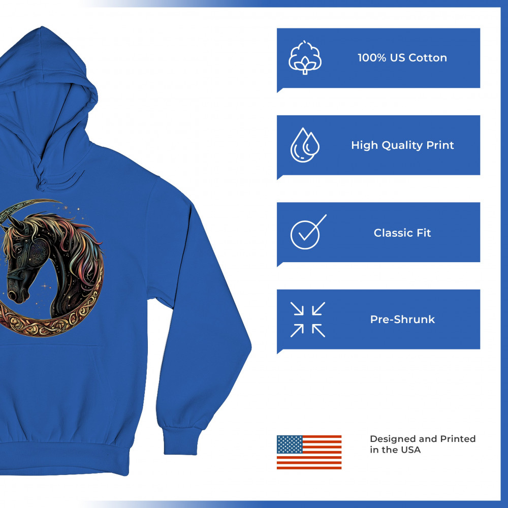 Celebrate the power and grace of the cosmos with this majestic black horse framed by a golden Celtic crescent moon. Its rainbow mane and celestial body symbolize strength, movement, mystery, and spiritual magic. A stunning piece for fantasy fans, equestrians, and dreamers who love horses and stars.