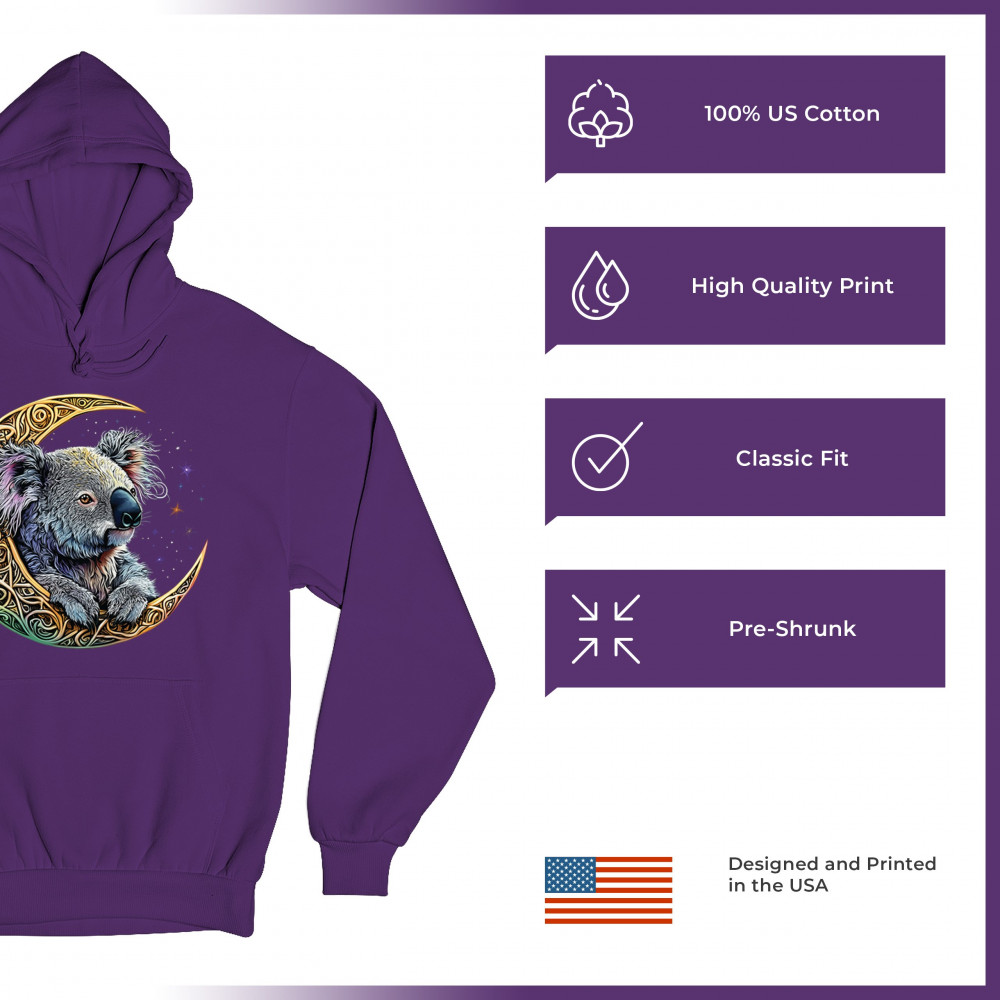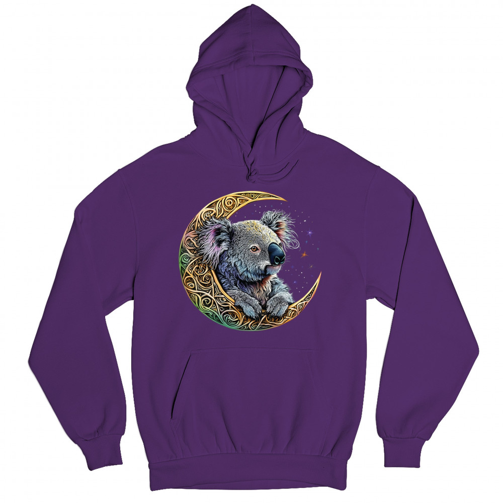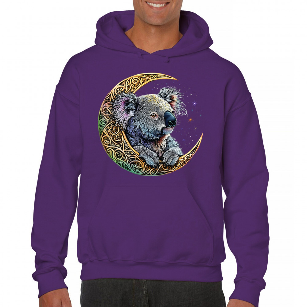 Koala resting in Celtic crescent moon with cosmic sky. A peaceful design for nature lovers, spiritual thinkers, and fantasy art fans.