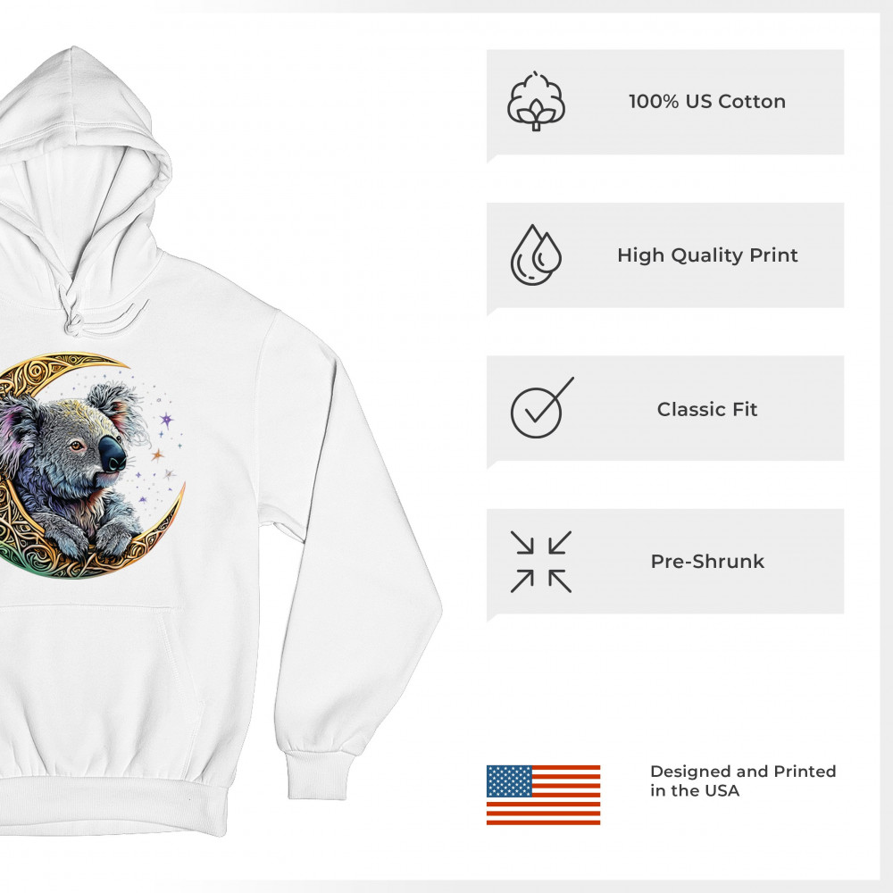 Koala resting in Celtic crescent moon with cosmic sky. A peaceful design for nature lovers, spiritual thinkers, and fantasy art fans.