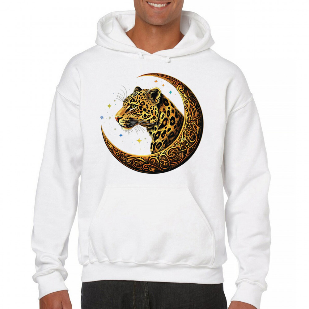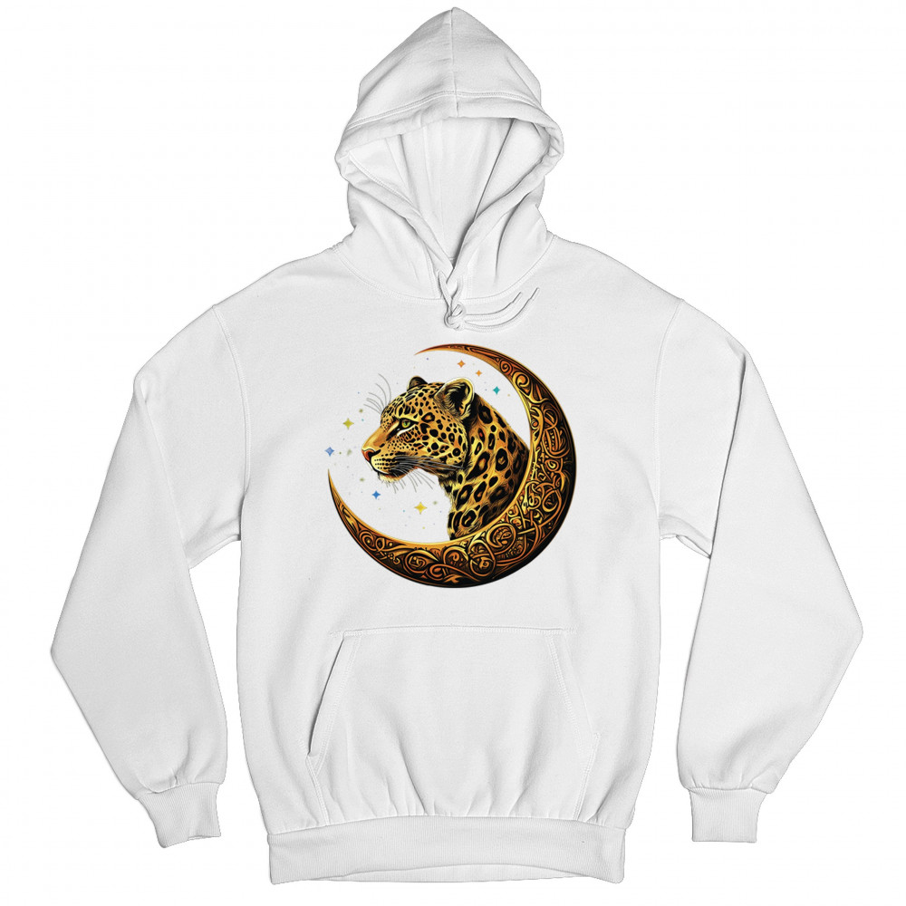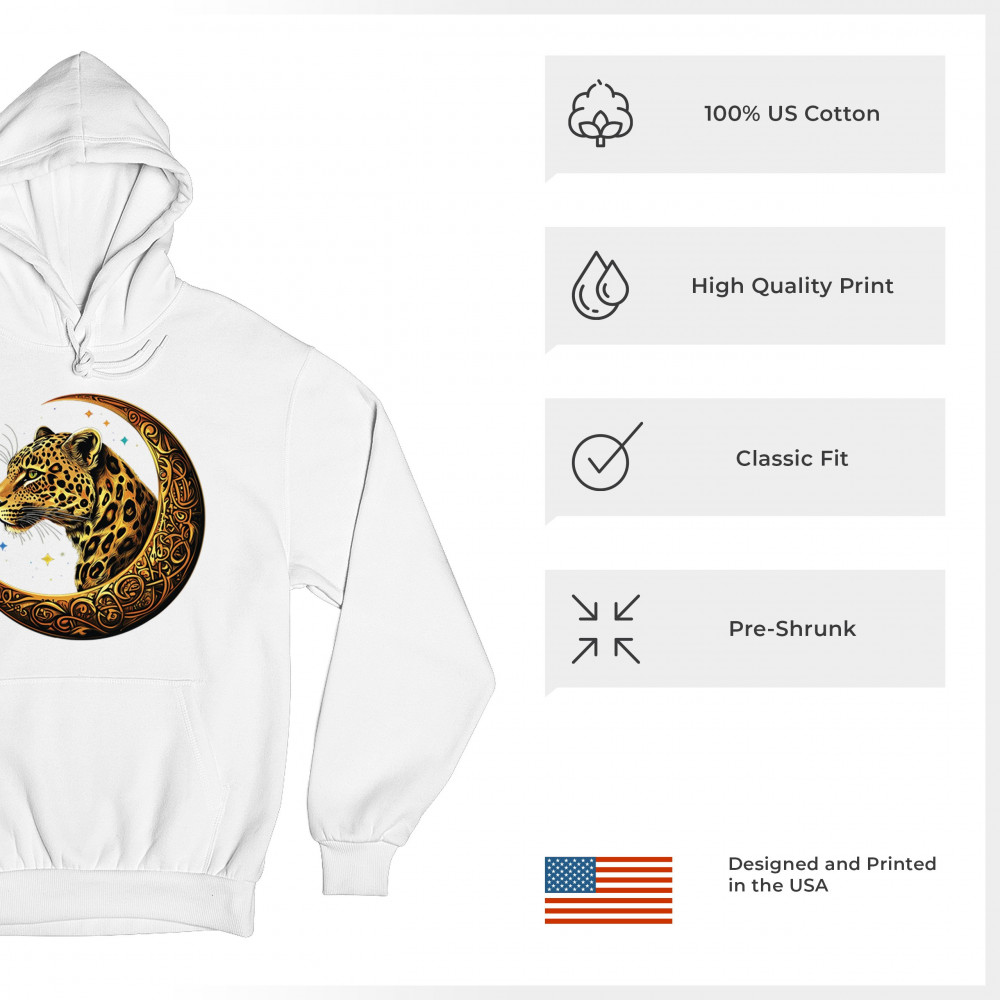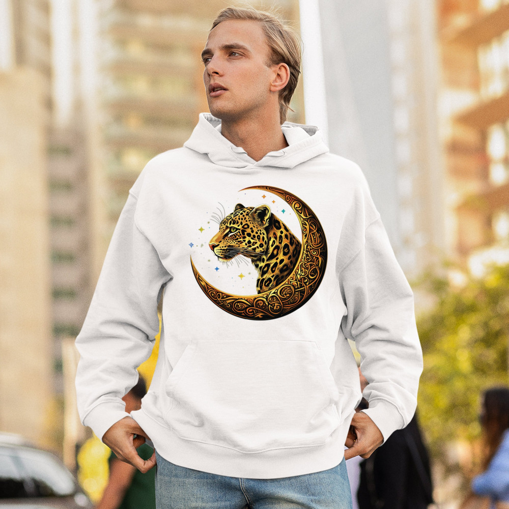 Unleash wild energy and spiritual symbolism with this bold leopard design set inside a golden Celtic crescent moon. A cosmic starry background amplifies its mystical vibe, symbolizing agility, independence, and awareness. Perfect for big cat lovers, jungle animal fans, and seekers of fantasy or tribal-inspired art.