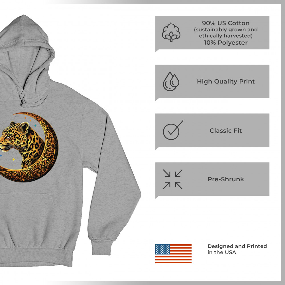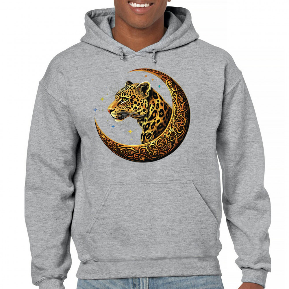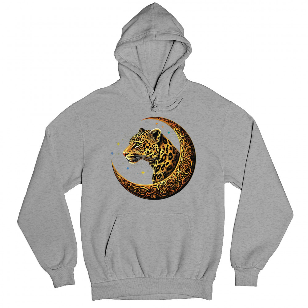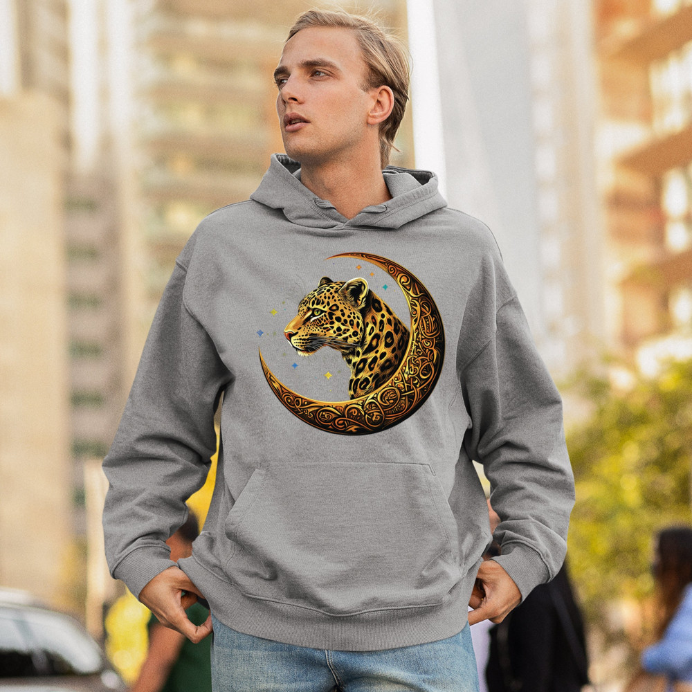 Unleash wild energy and spiritual symbolism with this bold leopard design set inside a golden Celtic crescent moon. A cosmic starry background amplifies its mystical vibe, symbolizing agility, independence, and awareness. Perfect for big cat lovers, jungle animal fans, and seekers of fantasy or tribal-inspired art.