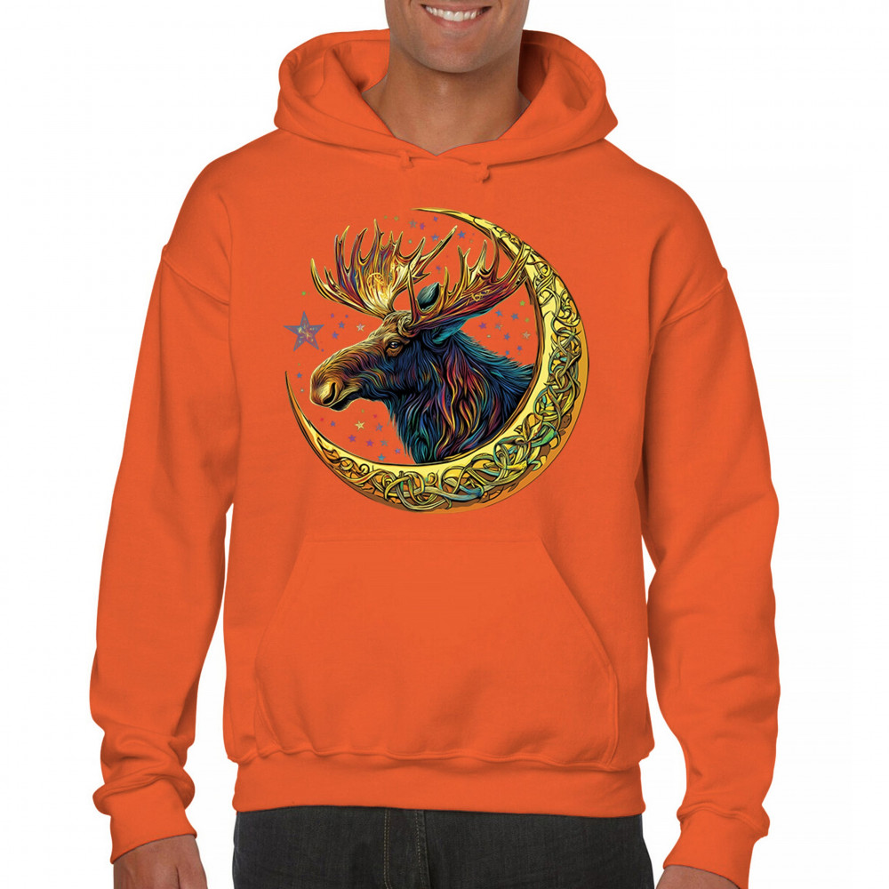 Mystical moose in gold Celtic crescent moon design—symbolizes strength, nature wisdom, and cosmic spirit for fantasy lovers and woodland fans.
