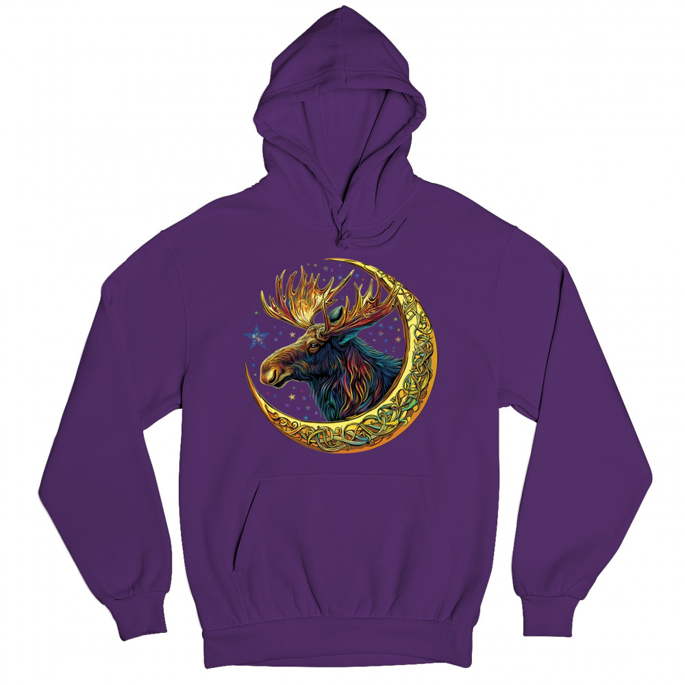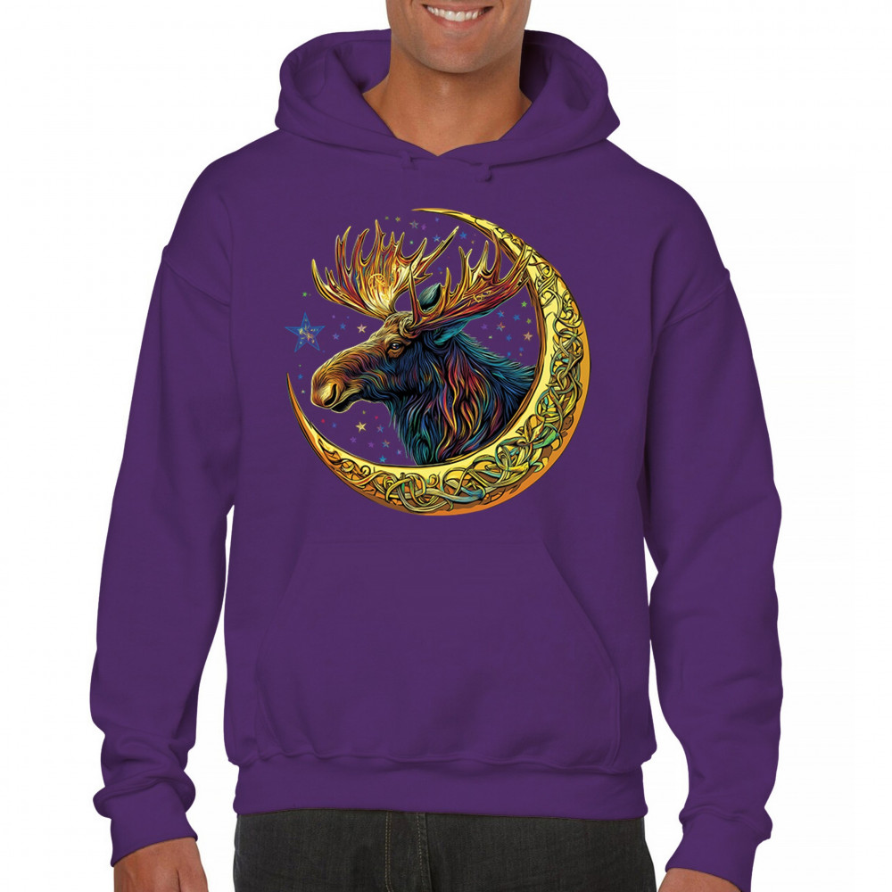 Mystical moose in gold Celtic crescent moon design—symbolizes strength, nature wisdom, and cosmic spirit for fantasy lovers and woodland fans.