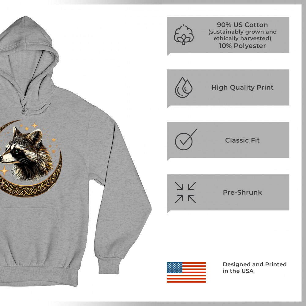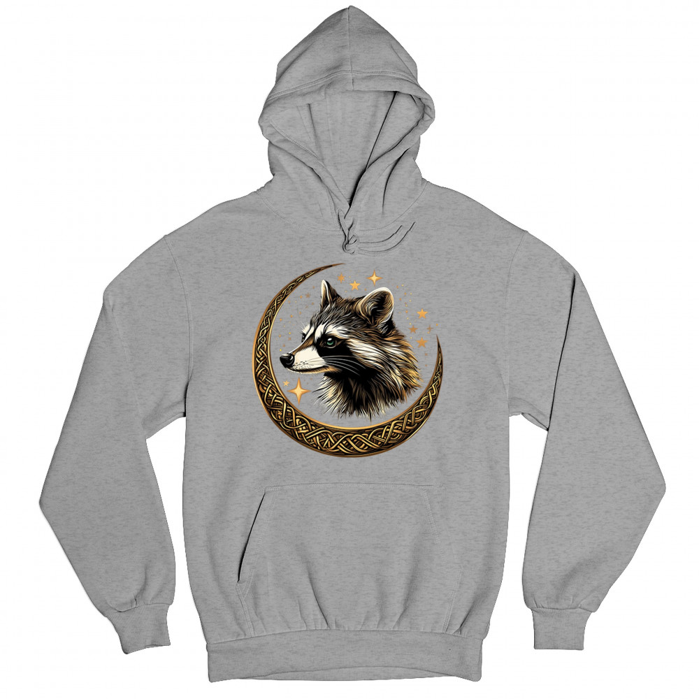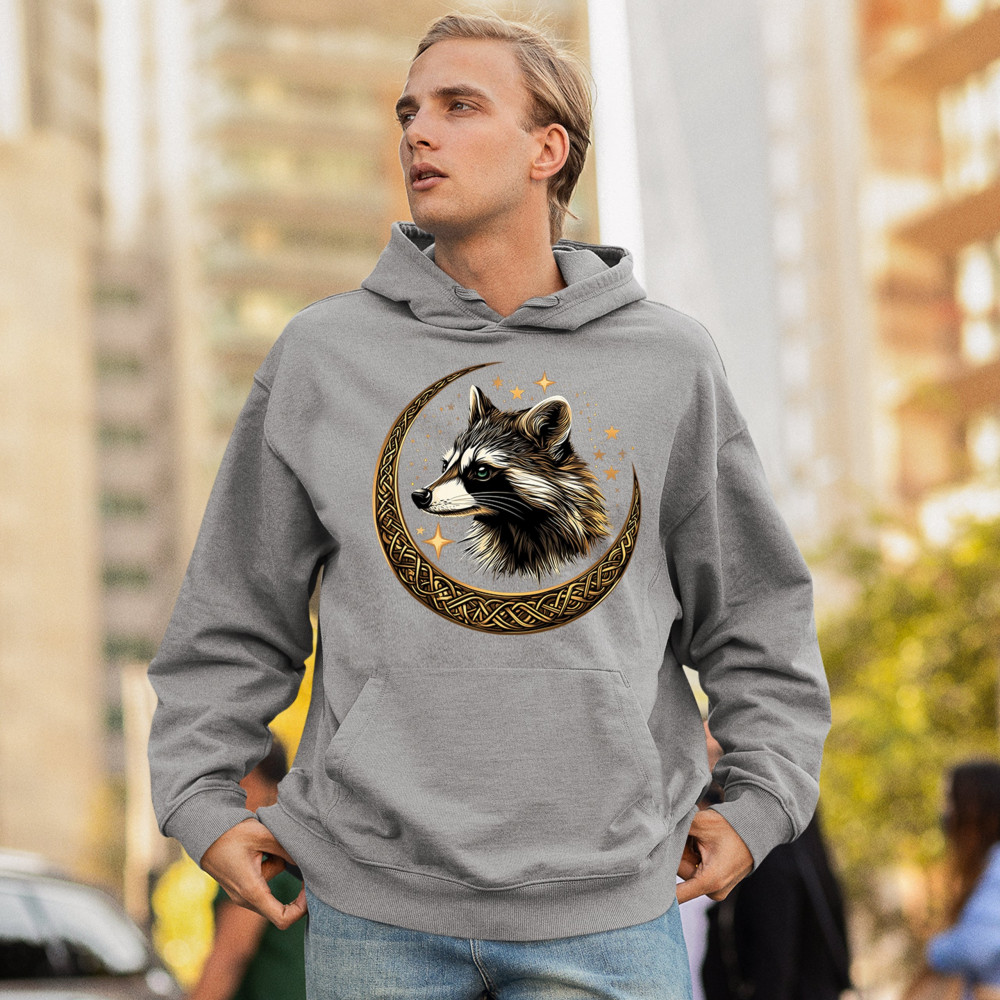 Cosmic raccoon design in Celtic moon. Symbol of adaptability, mystery, and spiritual intelligence. A perfect gift for wild and curious souls.