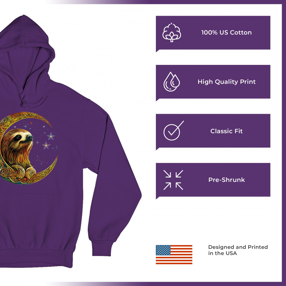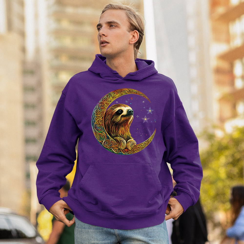 Celebrate peace and presence with this stunning sloth design cradled in a gold Celtic crescent moon. Surrounded by a vibrant starry sky, the image blends jungle whimsy with tribal patterns and mystical vibes. A perfect design for lovers of fantasy animals, mindfulness, and slow living. A beautiful tribute to spiritual stillness and cosmic calm.