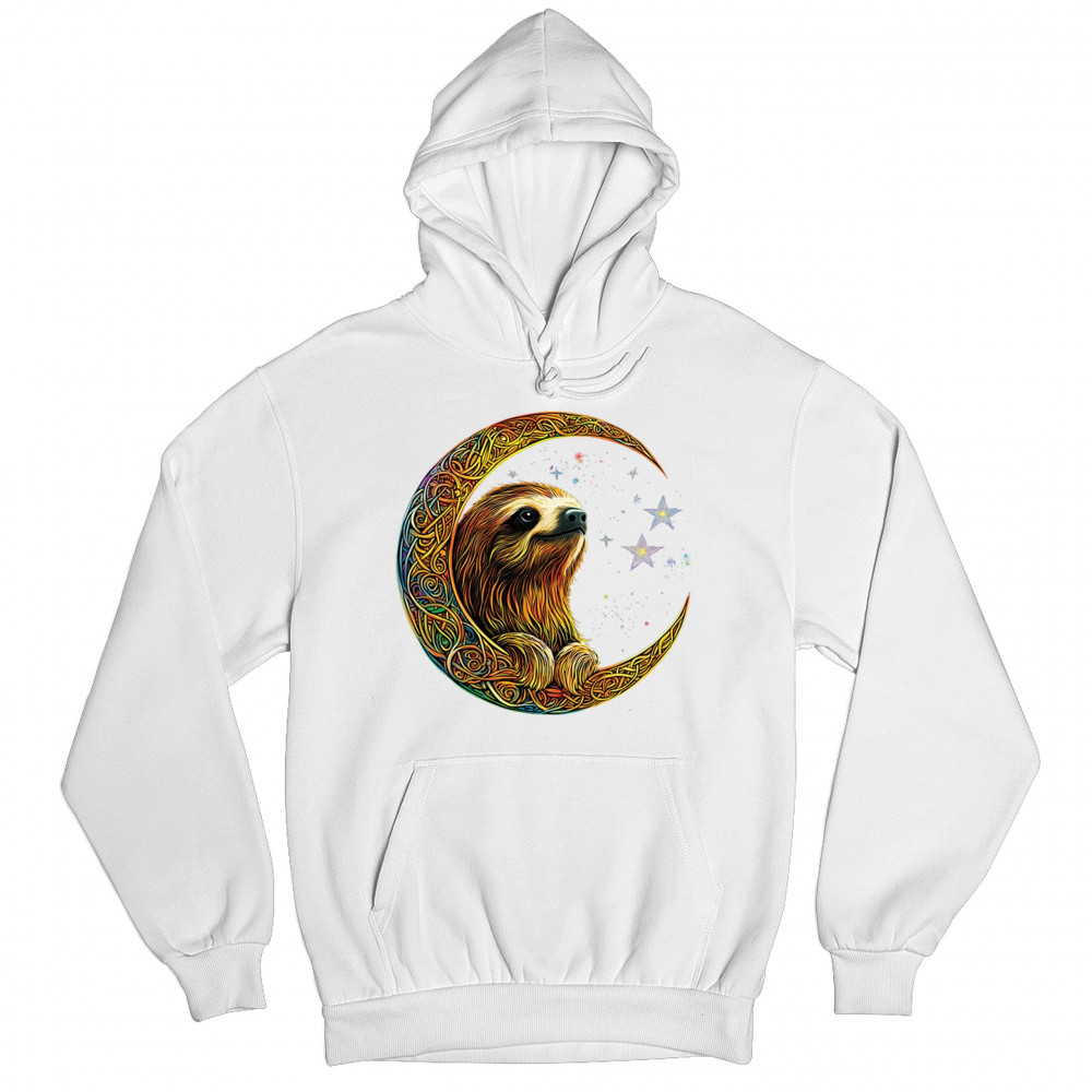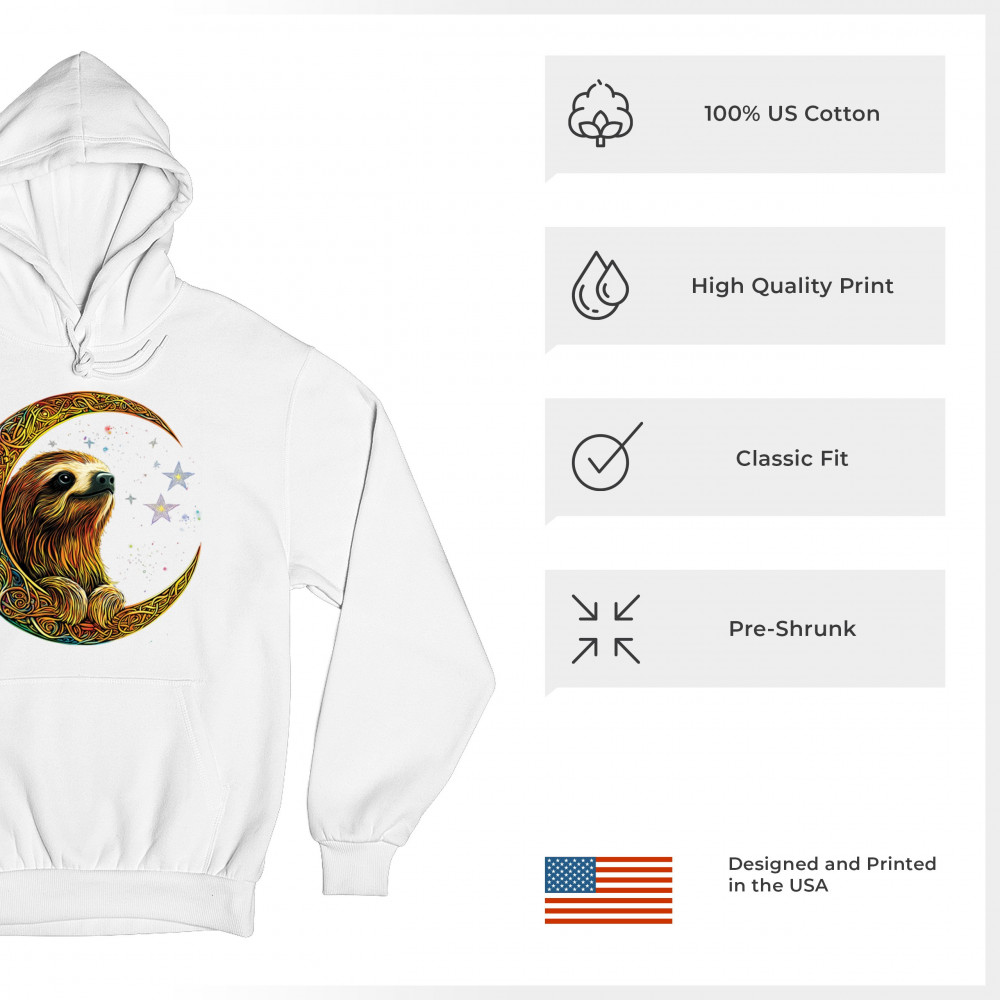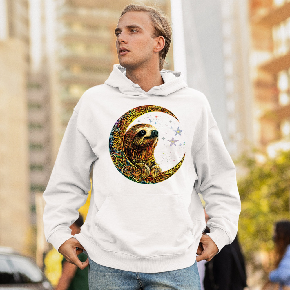 Celebrate peace and presence with this stunning sloth design cradled in a gold Celtic crescent moon. Surrounded by a vibrant starry sky, the image blends jungle whimsy with tribal patterns and mystical vibes. A perfect design for lovers of fantasy animals, mindfulness, and slow living. A beautiful tribute to spiritual stillness and cosmic calm.