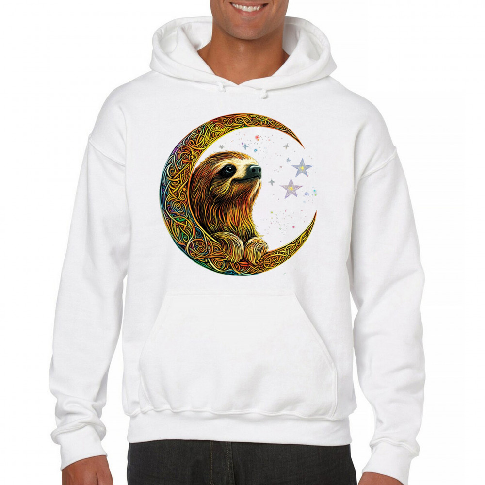 Peaceful sloth in Celtic crescent moon with cosmic sky. Symbol of mindfulness, rest, and intentional living. A calm, magical fantasy design.
