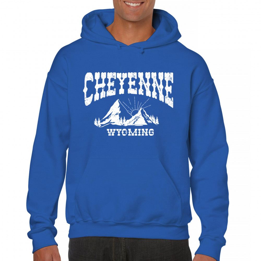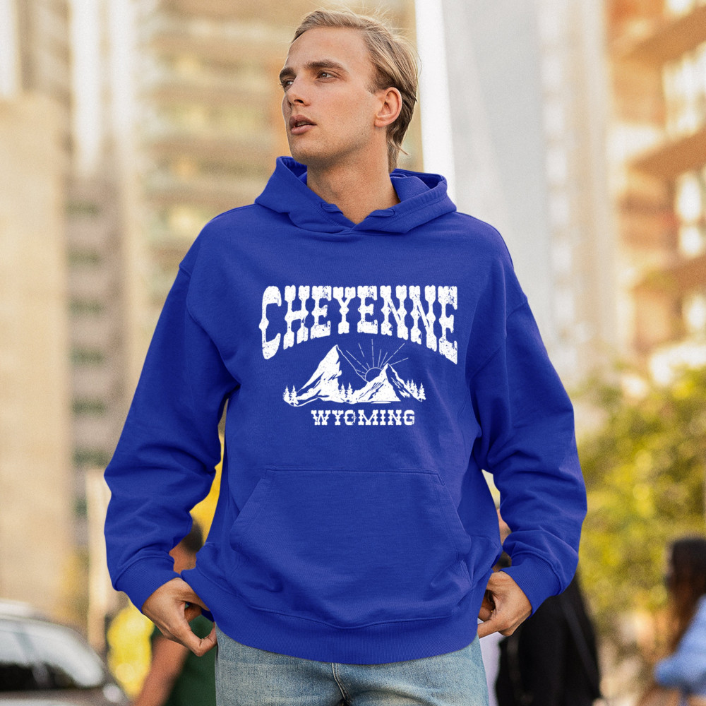 Vintage Cheyenne Wyoming design with mountain sunrise for outdoor lovers and locals. Perfect for travel, hiking, or Western pride.