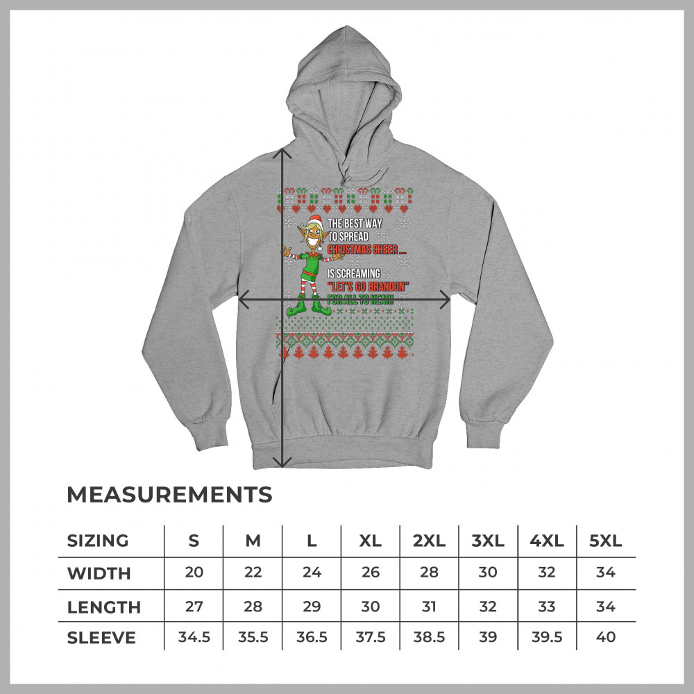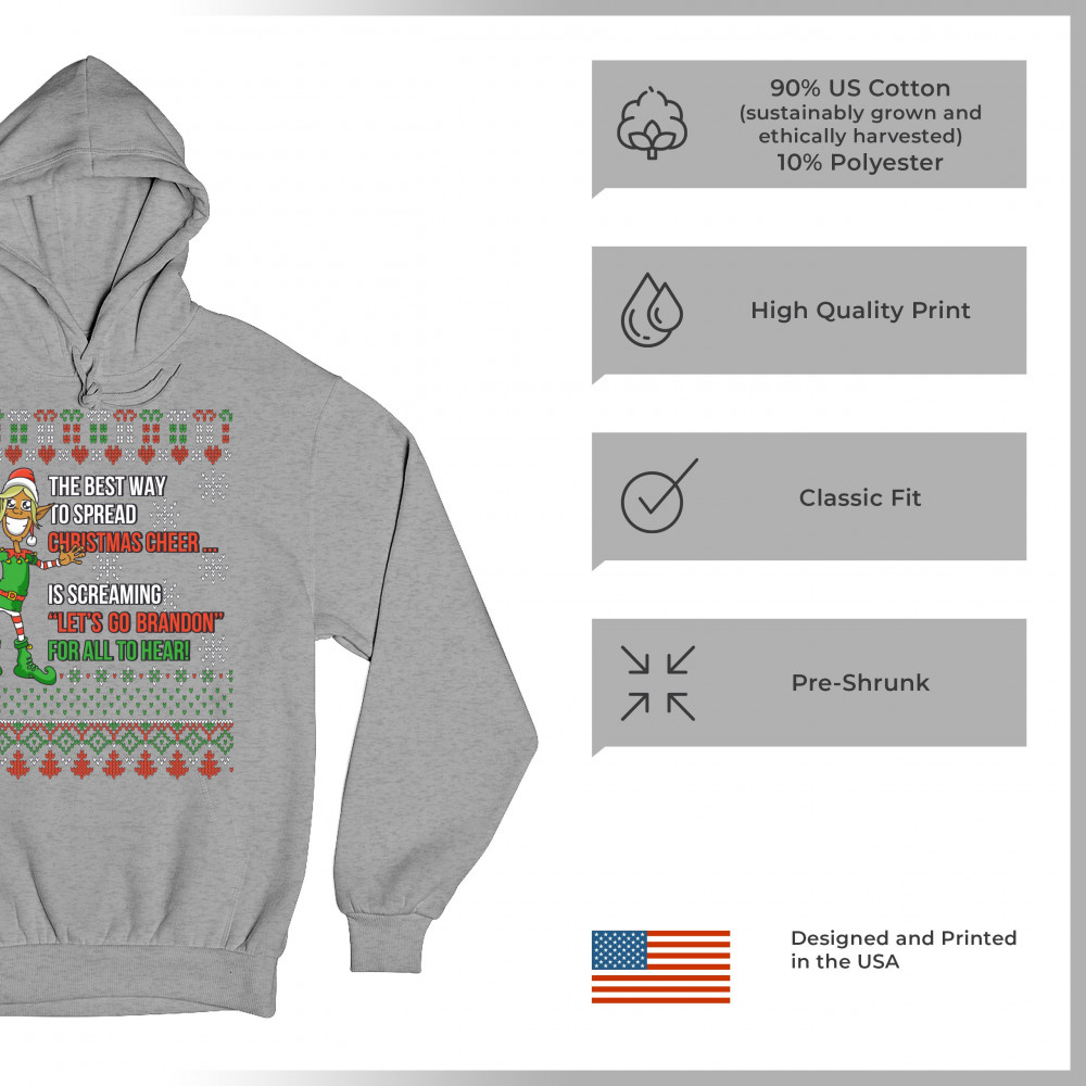 A funny print saying: "The Best Way to Spread Christmas Cheer Is Screaming Let's Go Brandon for All to Hear" and featuring a smiling elf. The print is decorated as a Christmas ugly Sweater. A great choice to wear for a Christmas or New Year's Eve party an