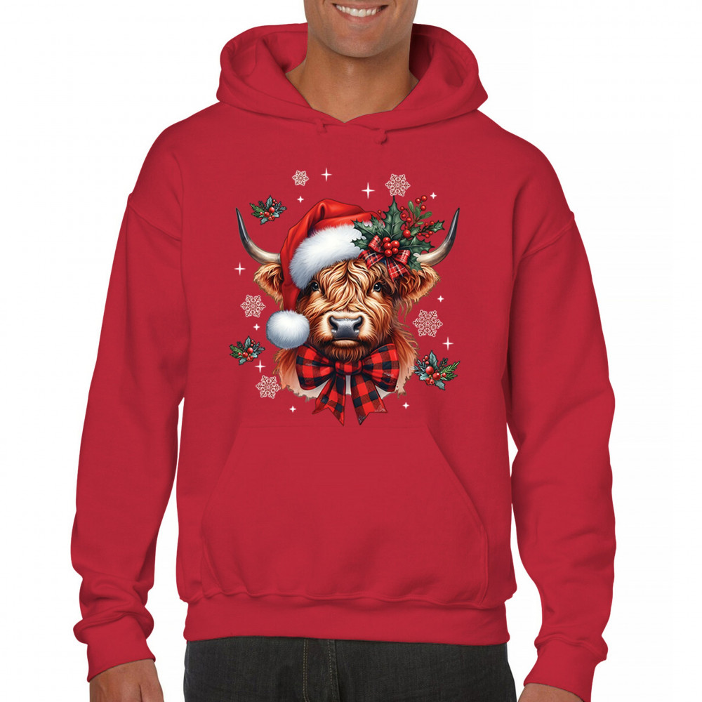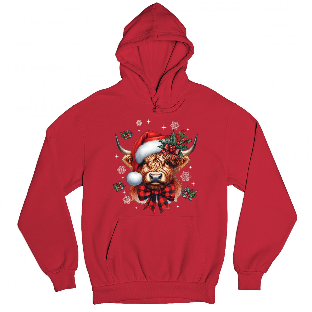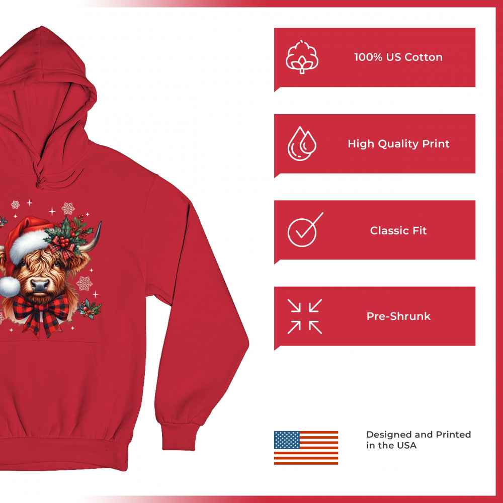 Festive Highland cow Christmas design with Santa hat, plaid bow, holly, and rustic farmhouse holiday charm. Perfect for cozy winter decor.