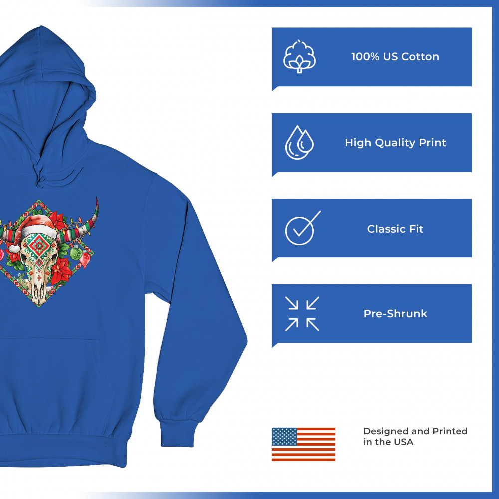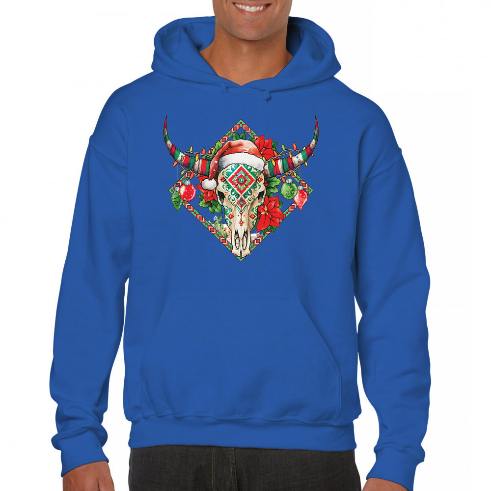 Blend Southwestern charm with holiday cheer! This vibrant skull design with poinsettias and ornaments is perfect for festive parties and unique gifts!