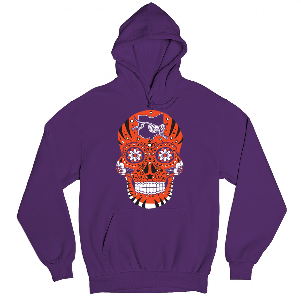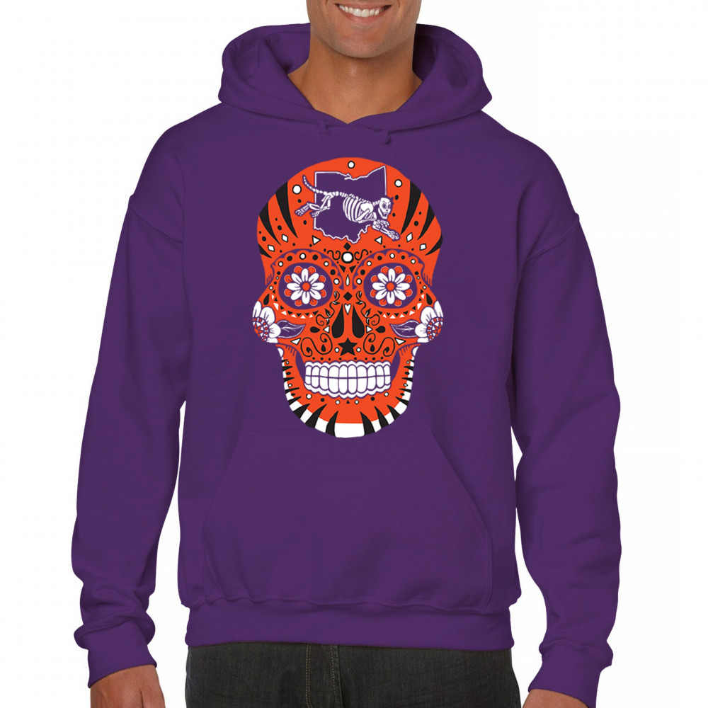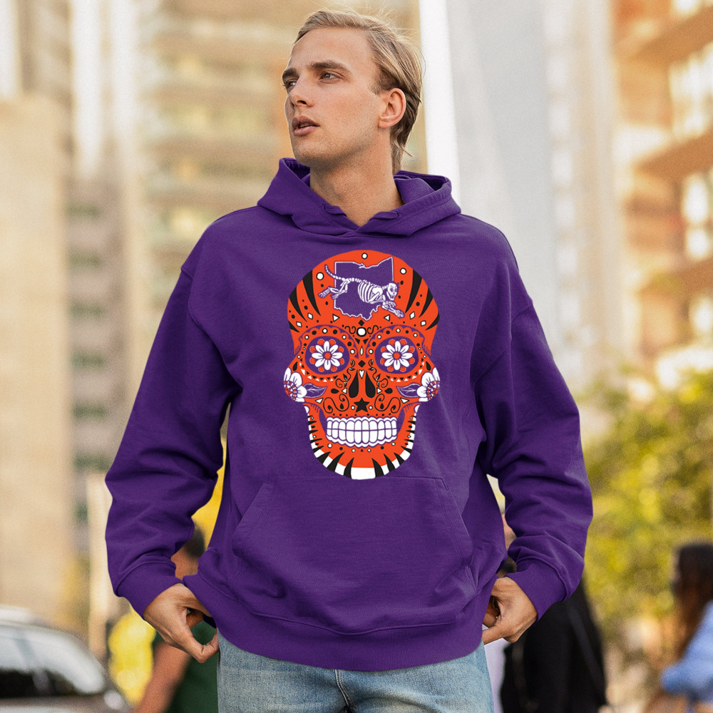 Cinci Sugar Skull with Queen City Paw, underdog grit, black & orange pride, Game Day energy, and playoff vibes.