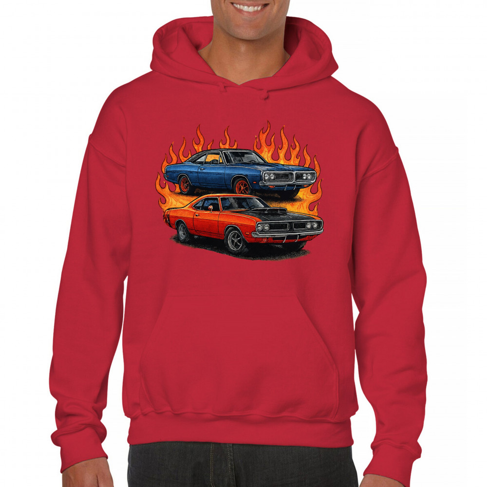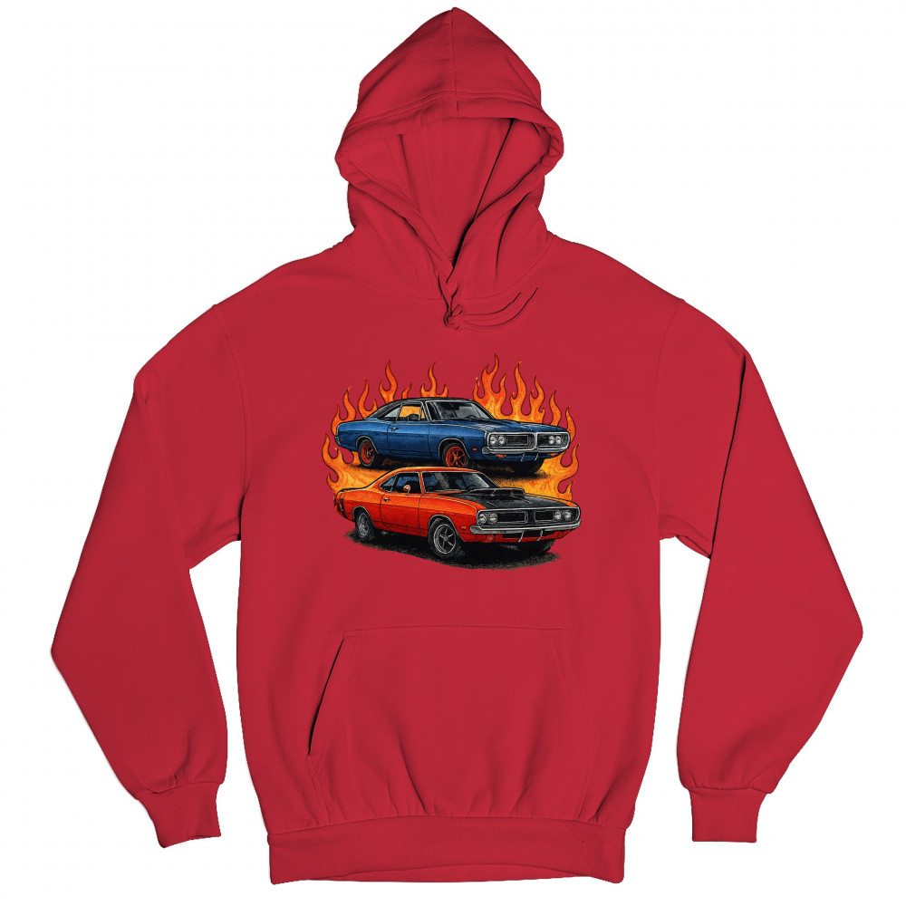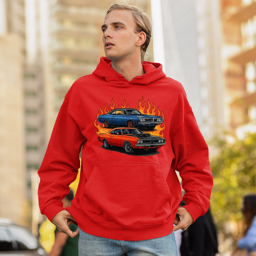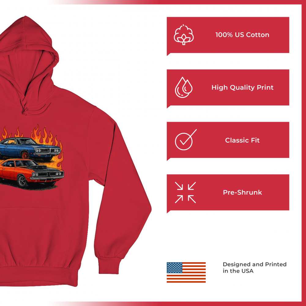 Bold flame design with classic muscle cars for gearheads and vintage horsepower lovers. Perfect for shows, cruise meets, and burnout nights.