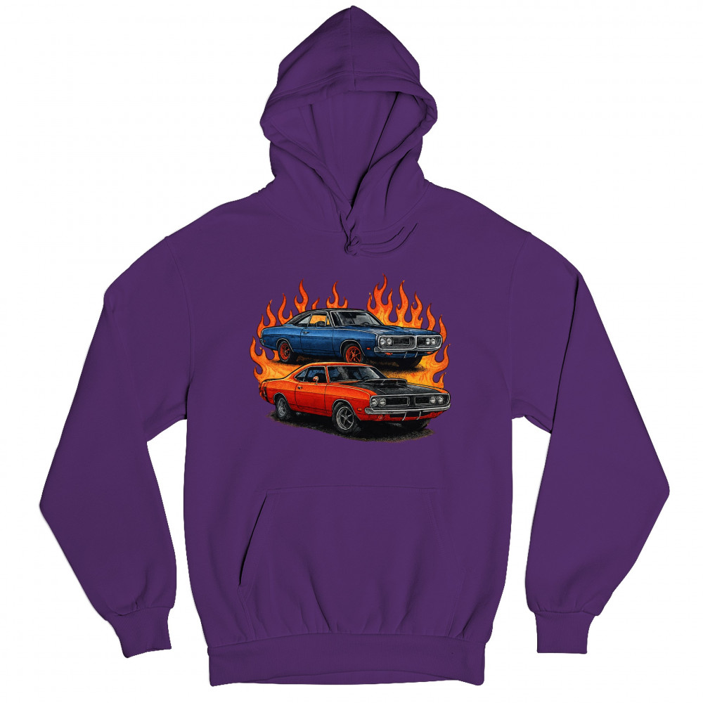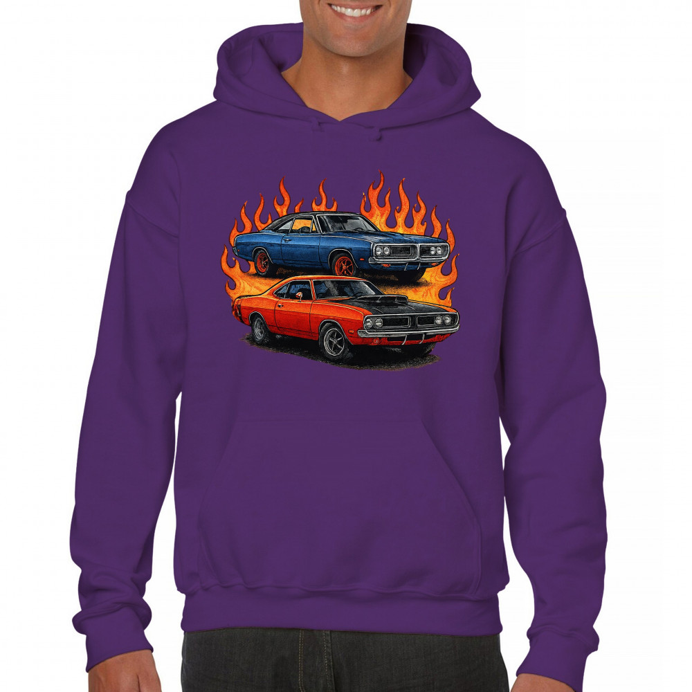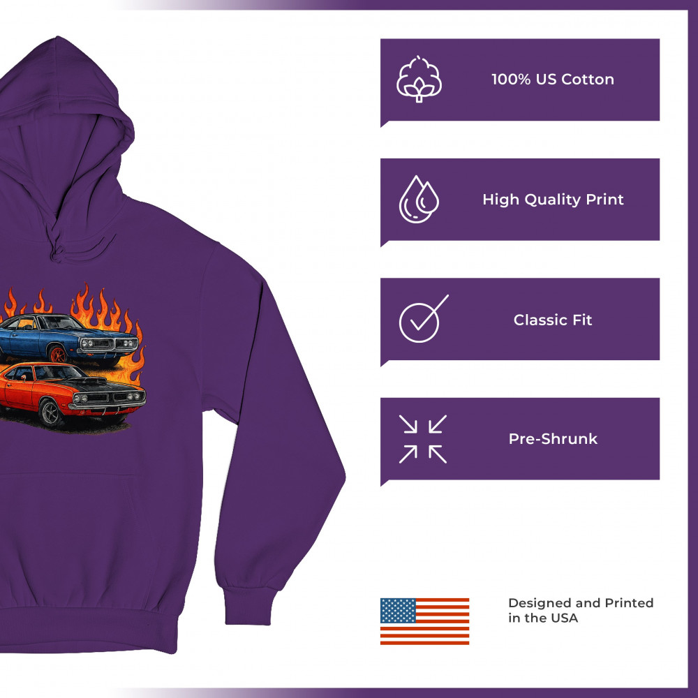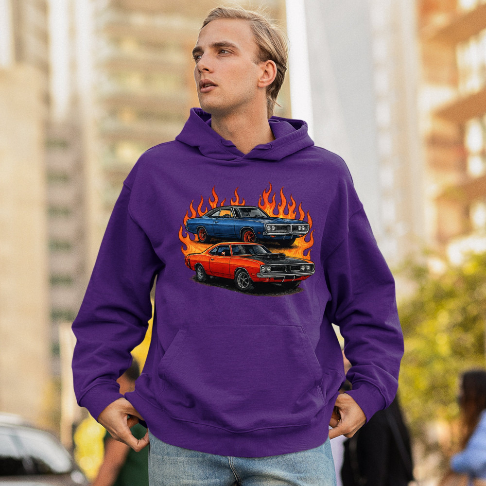 Bold flame design with classic muscle cars for gearheads and vintage horsepower lovers. Perfect for shows, cruise meets, and burnout nights.