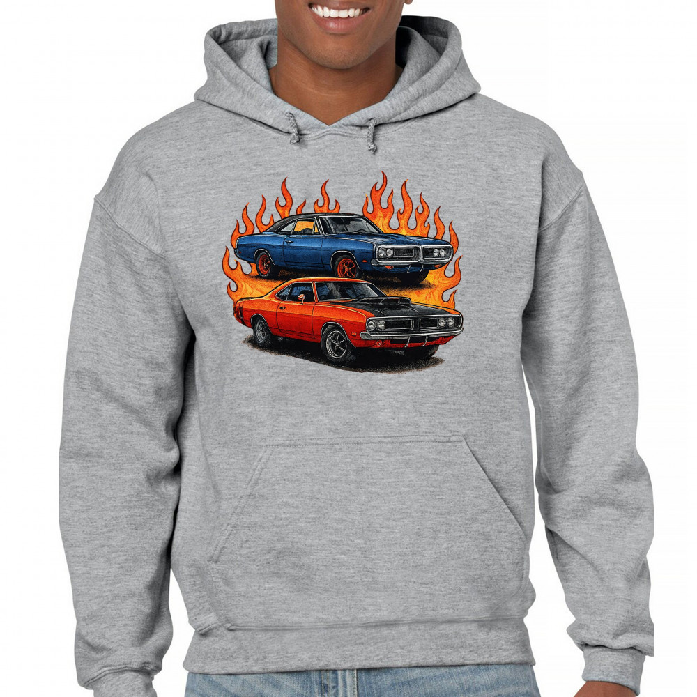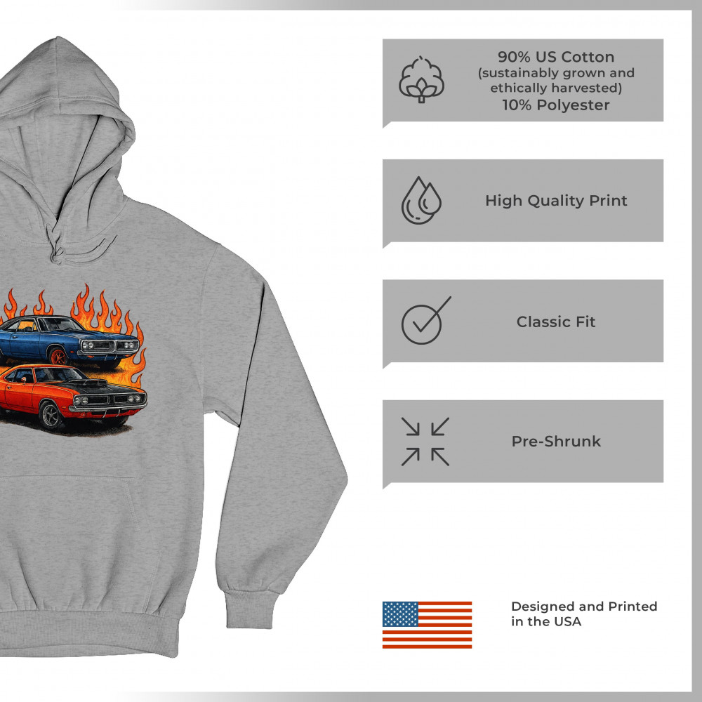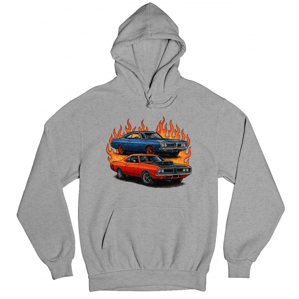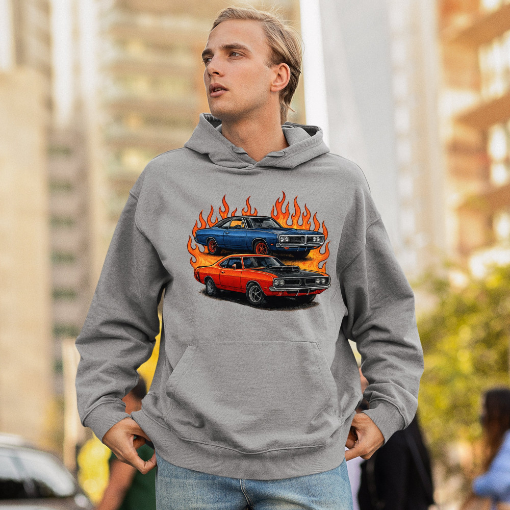 Bold flame design with classic muscle cars for gearheads and vintage horsepower lovers. Perfect for shows, cruise meets, and burnout nights.
