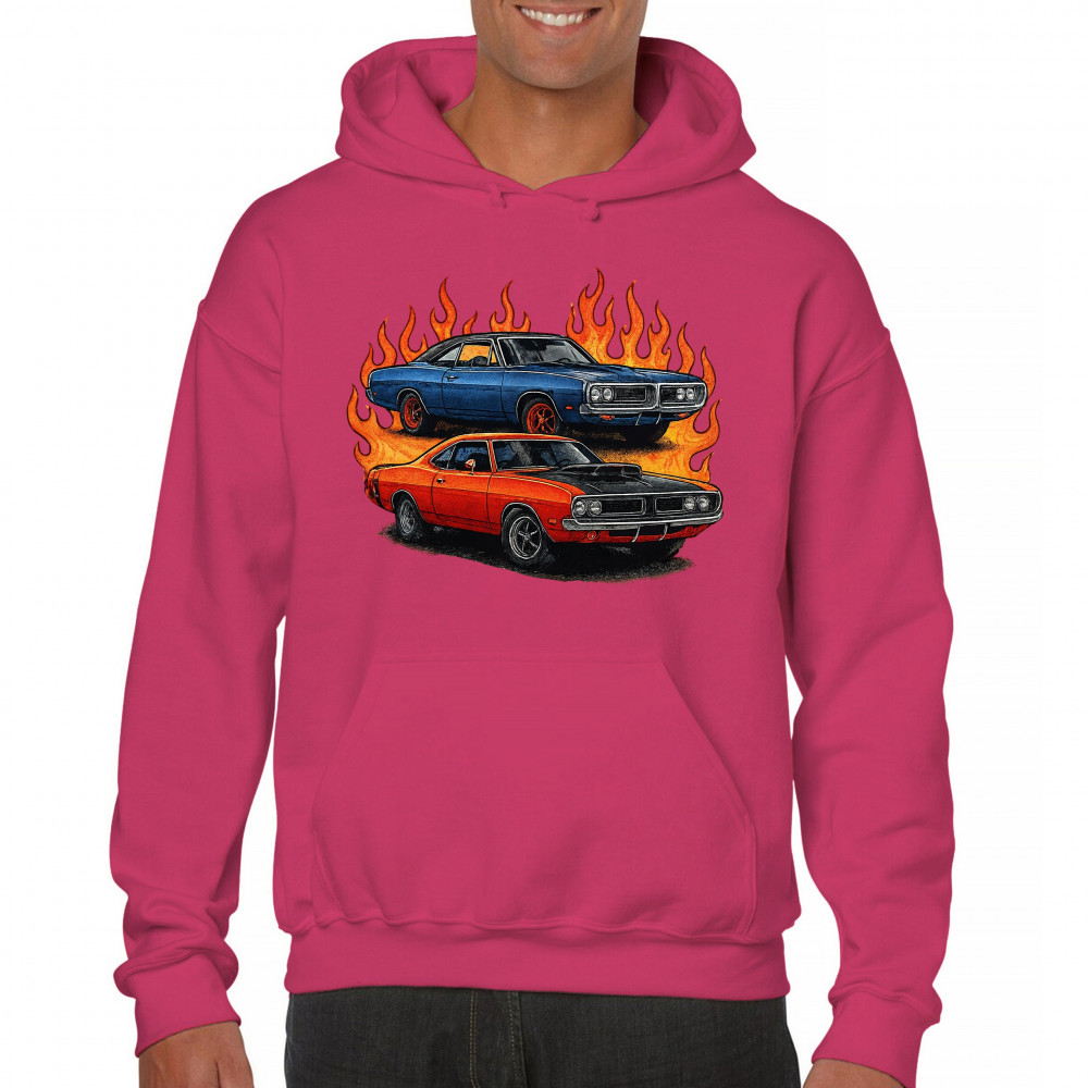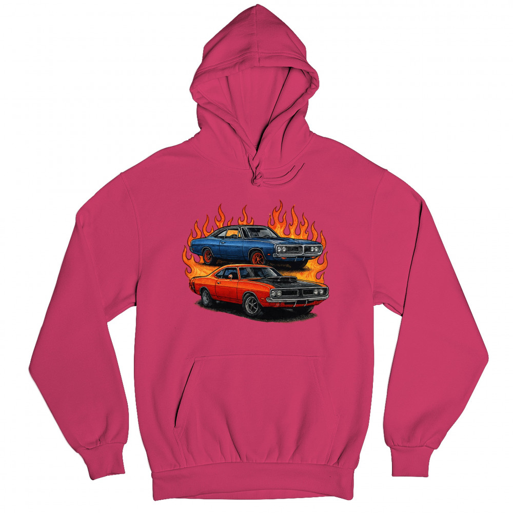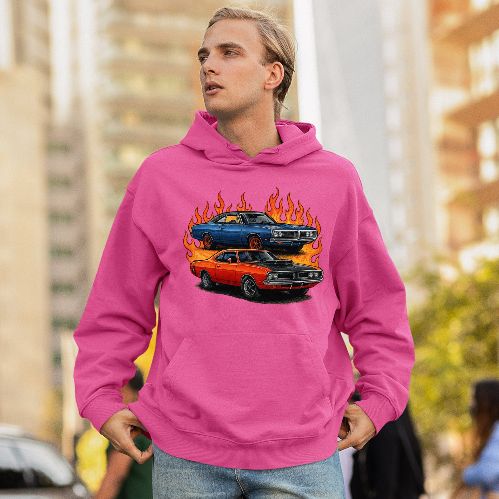 Bold flame design with classic muscle cars for gearheads and vintage horsepower lovers. Perfect for shows, cruise meets, and burnout nights.