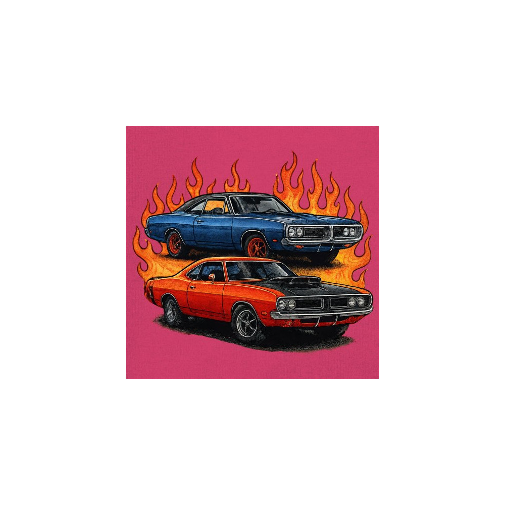 This flame-wrapped design showcases two classic muscle cars set ablaze with attitude, style, and vintage horsepower. Made for adrenaline seekers, rev heads, and car lovers who thrive on raw speed and retro fire. Whether at a burnout meet or a car show, this design lets your muscle car pride burn bright.